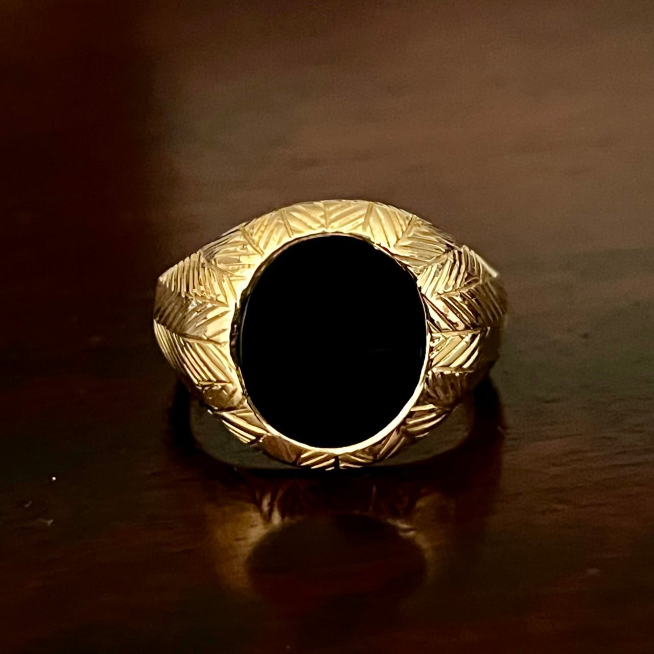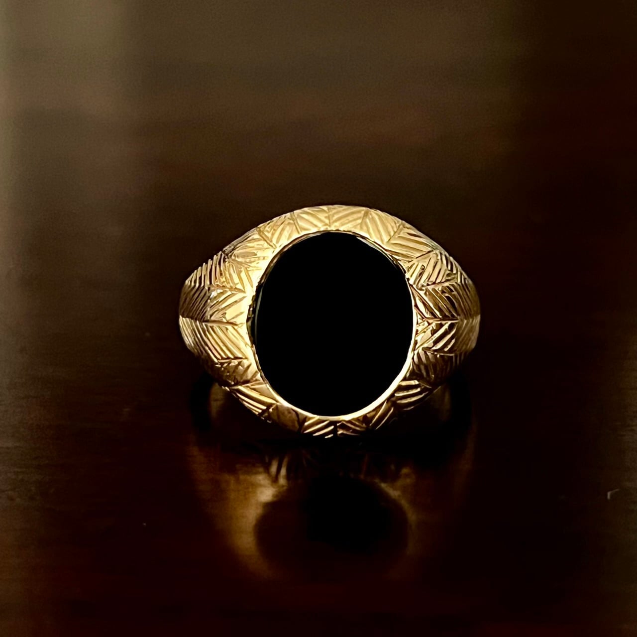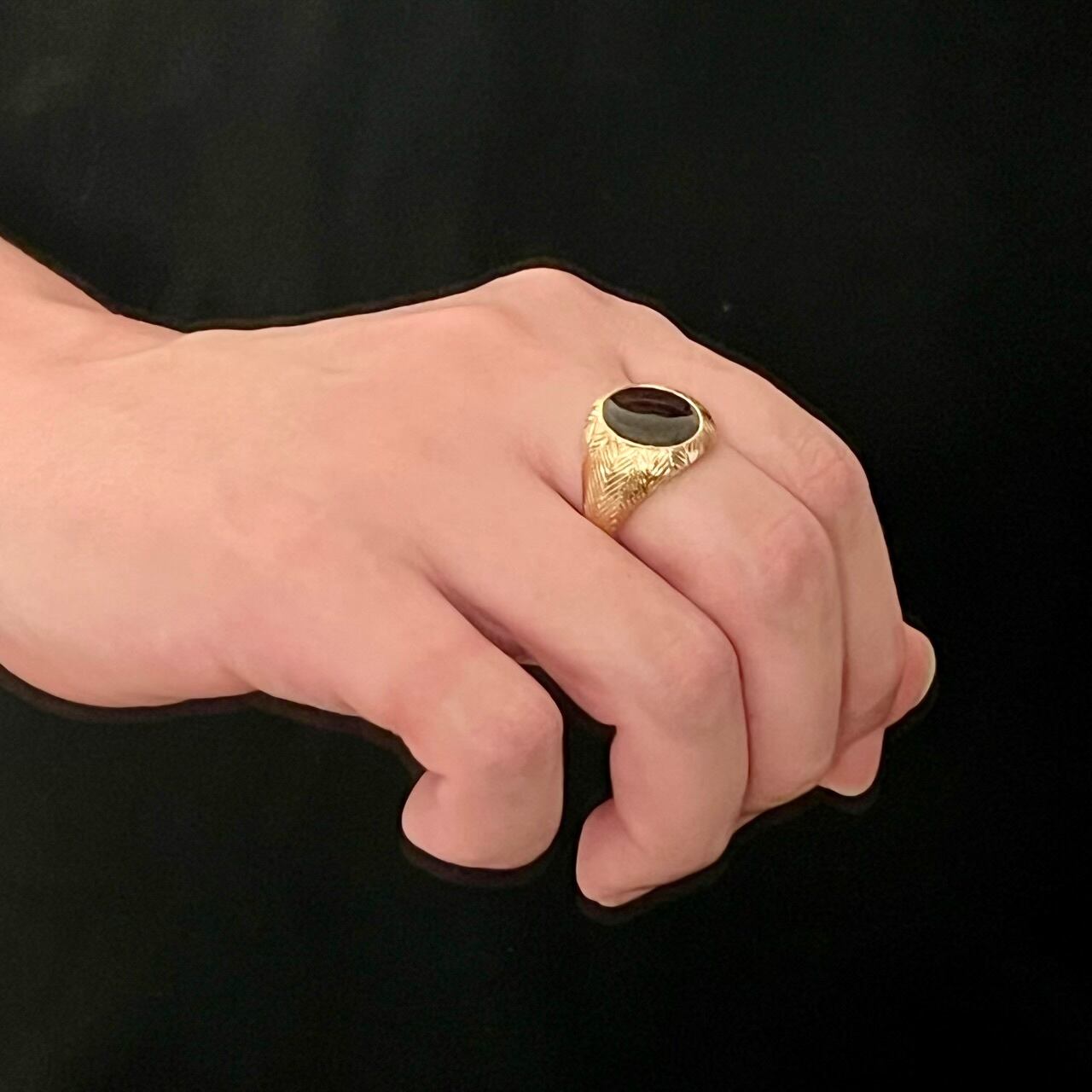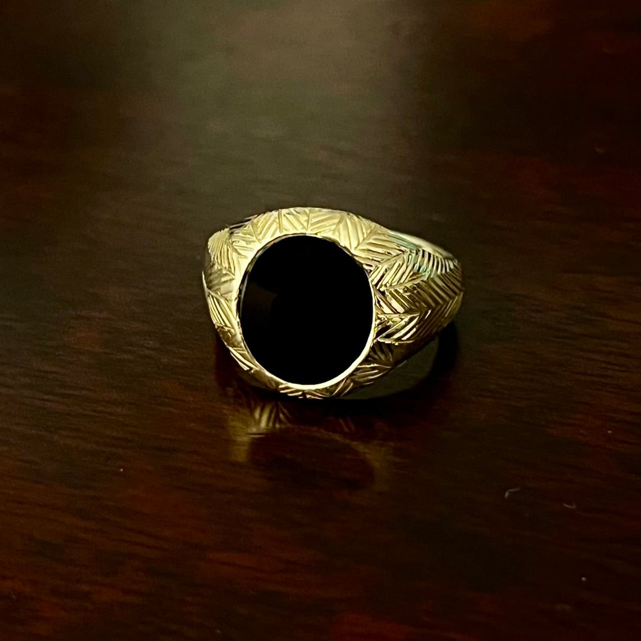 こちらはセンターにセットされたオーバル型のブラックオニキスを中心に、ヘリンボーン模様が入った14K ゴールドのシグネットリング。