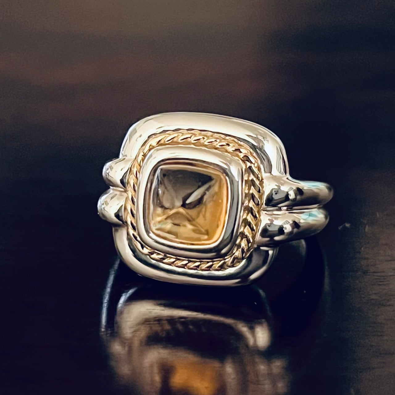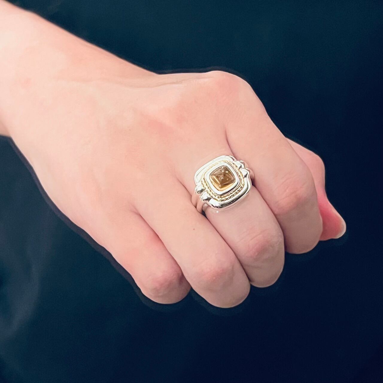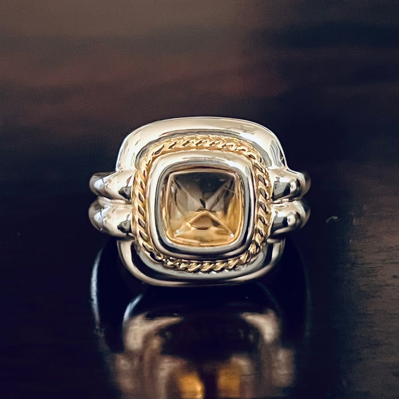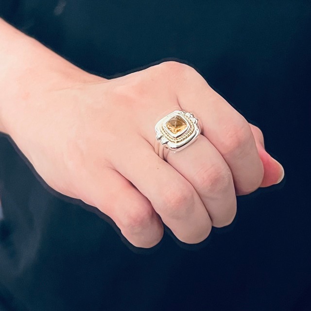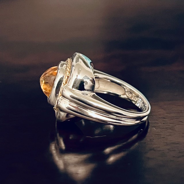 センターにはシュガーローフ カット(ピラミッドのような形のカット)のシトリン、その周りには18金でツイストロープの装飾が入ったティファニーのコンビ リング。