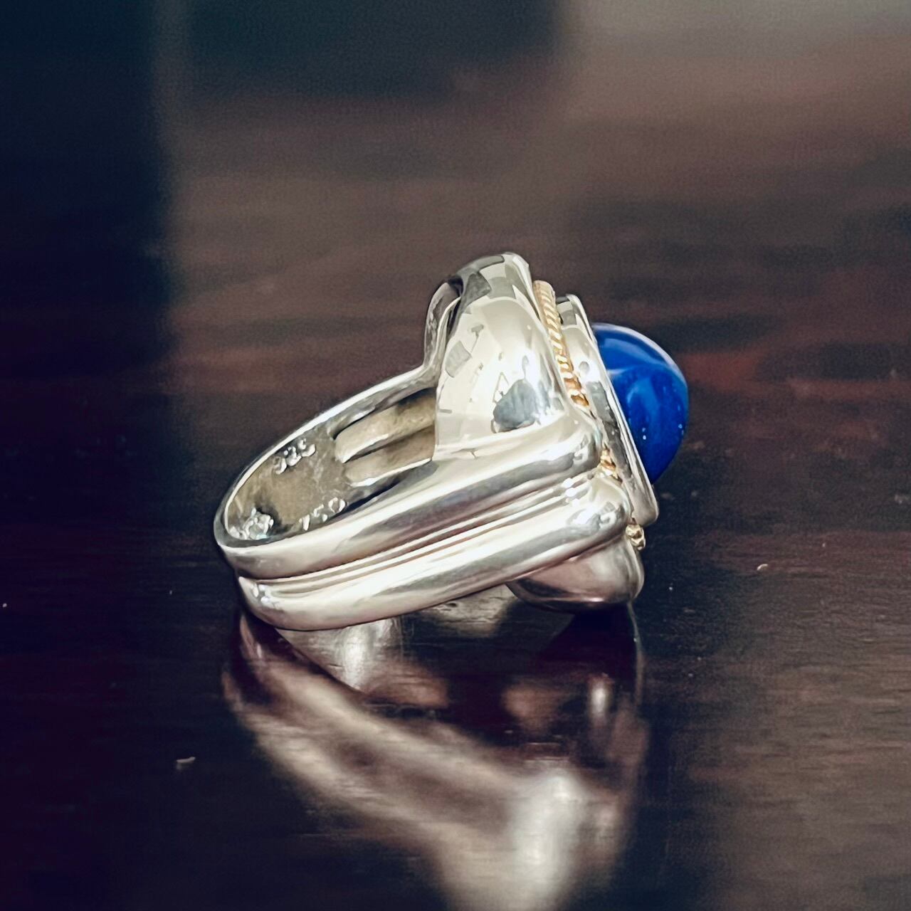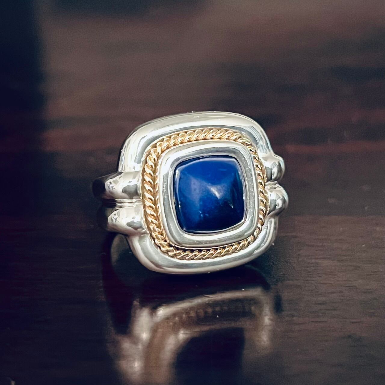センターにはシュガーローフ カット(ピラミッドのような形のカット)のラピス ラズリ、その周りには18金でツイストロープの装飾が入ったティファニーのコンビ リング。