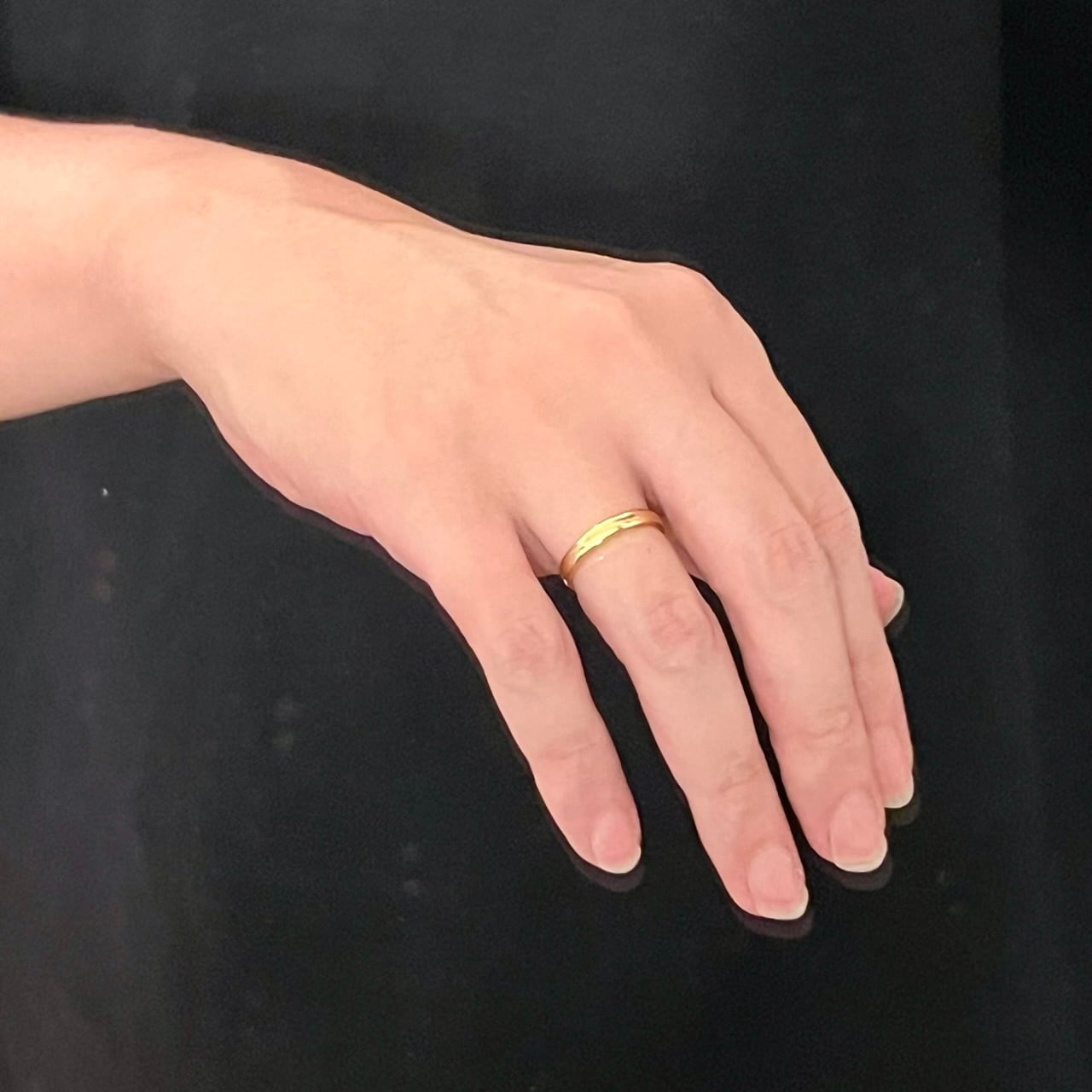 メンズ・レディース問わないシンプルなデザインにバンド リング特有の汎用性の高い形状は重ね付けにも適した作品、幅が約3mmなのでお手持ちのリングとのスタッキングにも適したボリューム感です。