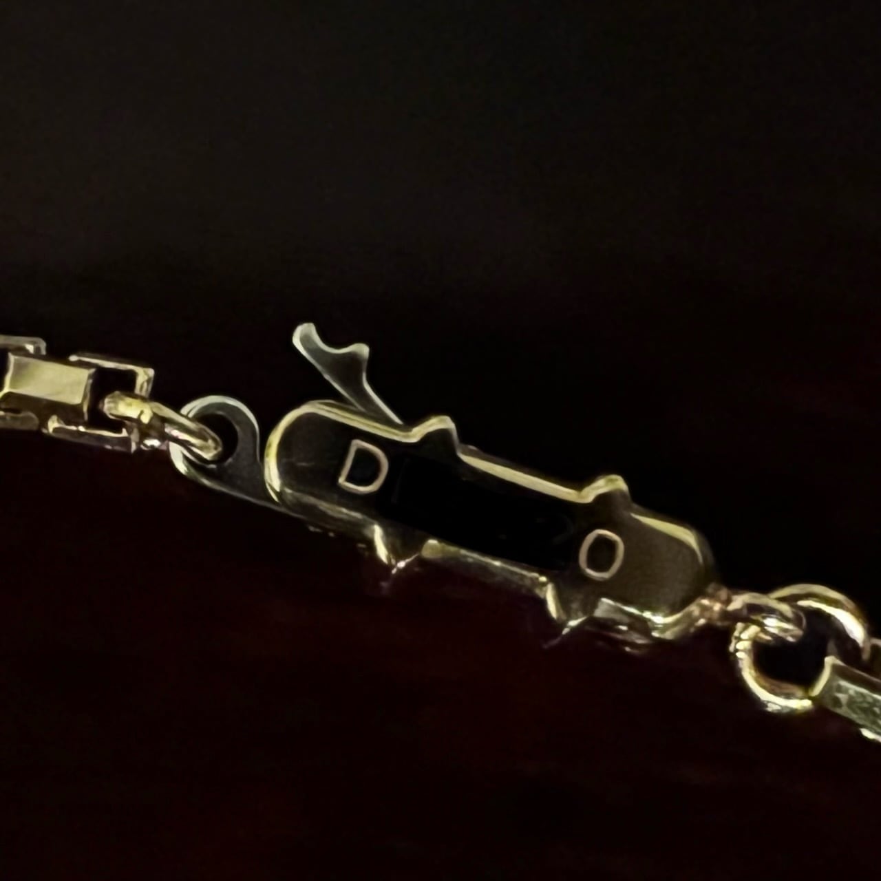 留め具は意匠の凝らされた差し込み式で、一度フックを引っ掛けて差し込む仕様、チェーンとほぼ同じ幅で留め具が目立たないのもポイントです。