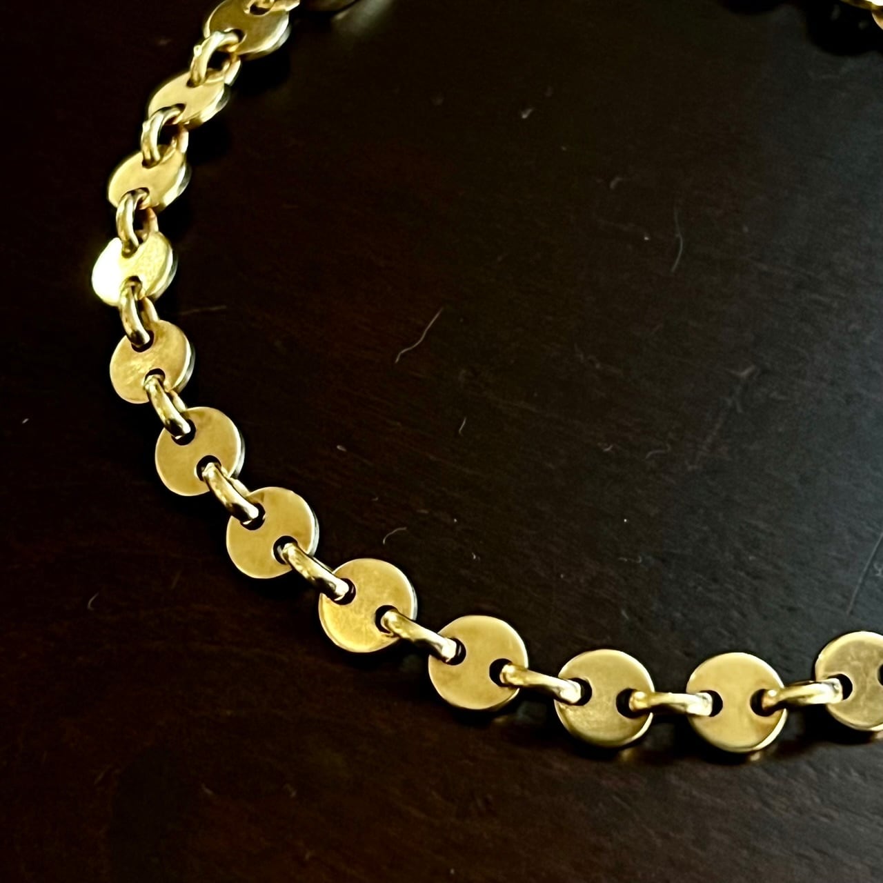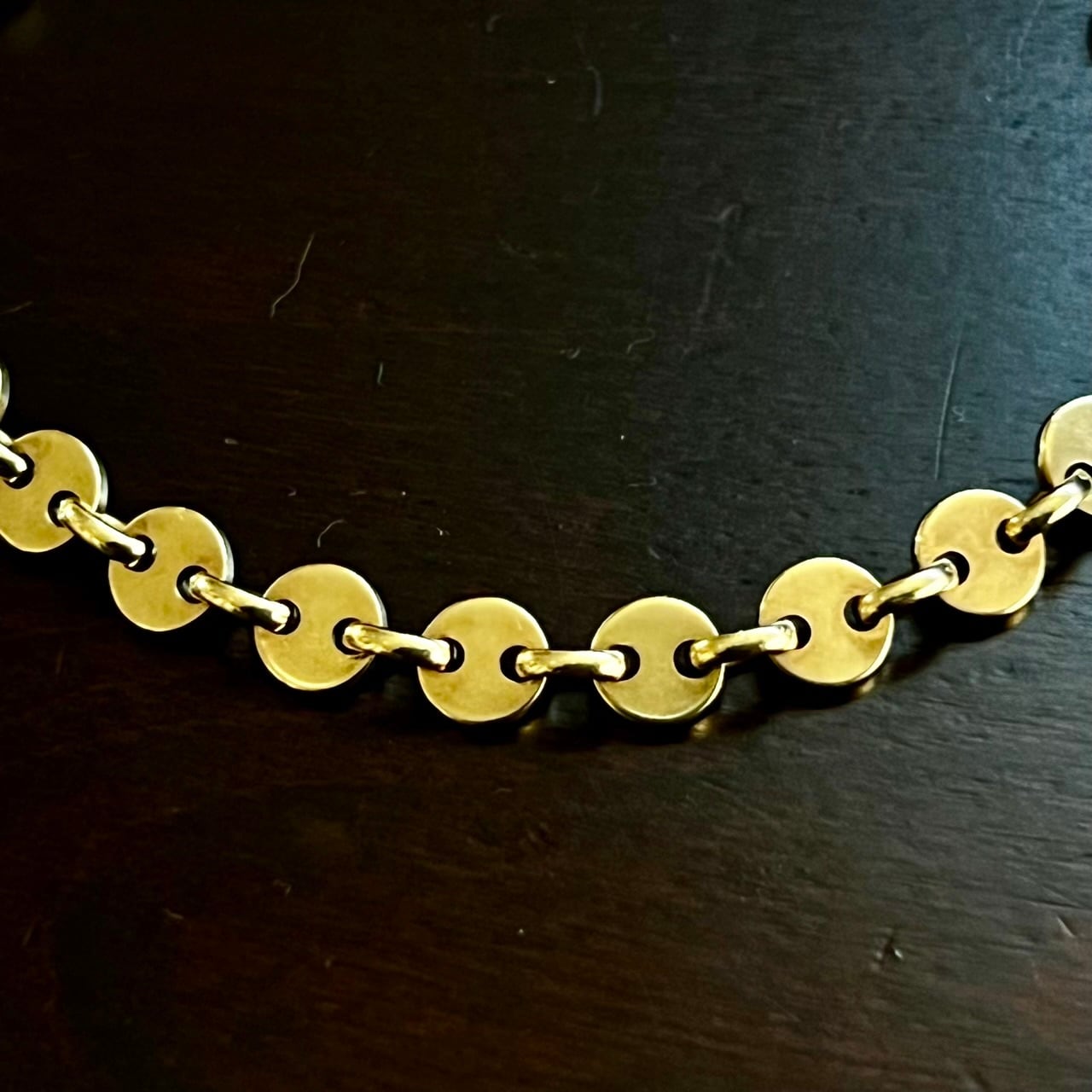 一見、丸みを帯びたアンカーチェーンにも見える形状のサークル リンクはオーバル リンクと交互に連なり、シンプルな造形ですが、真円のフォルムが際立つバランスの良いデザイン、1990年代のお品物です。