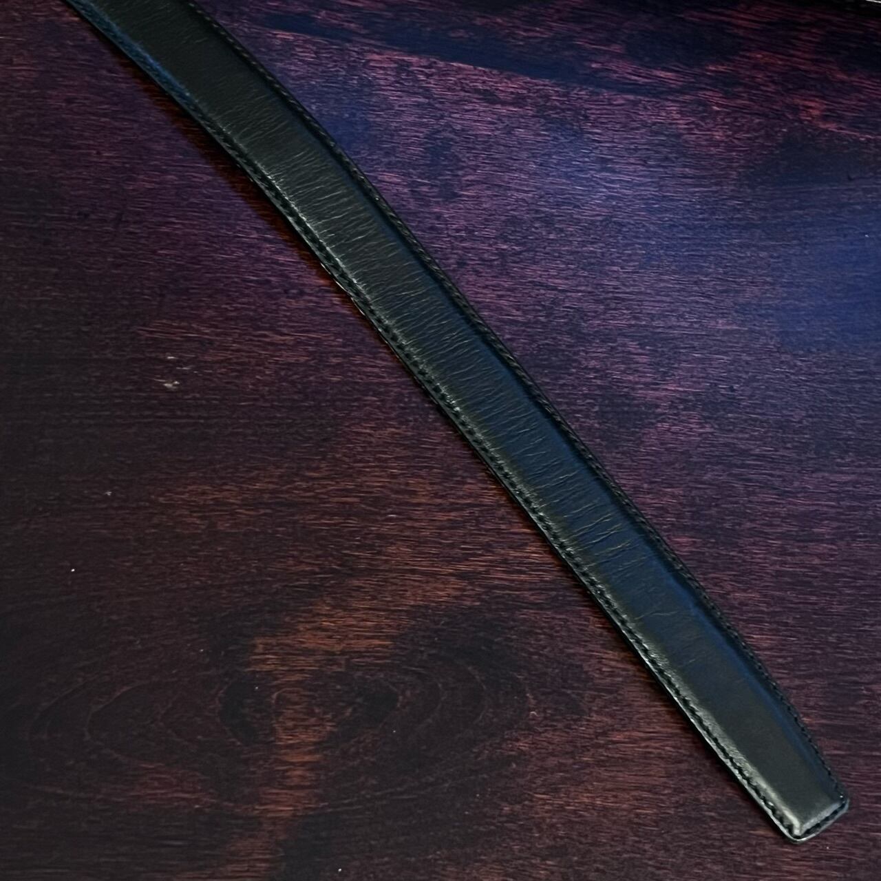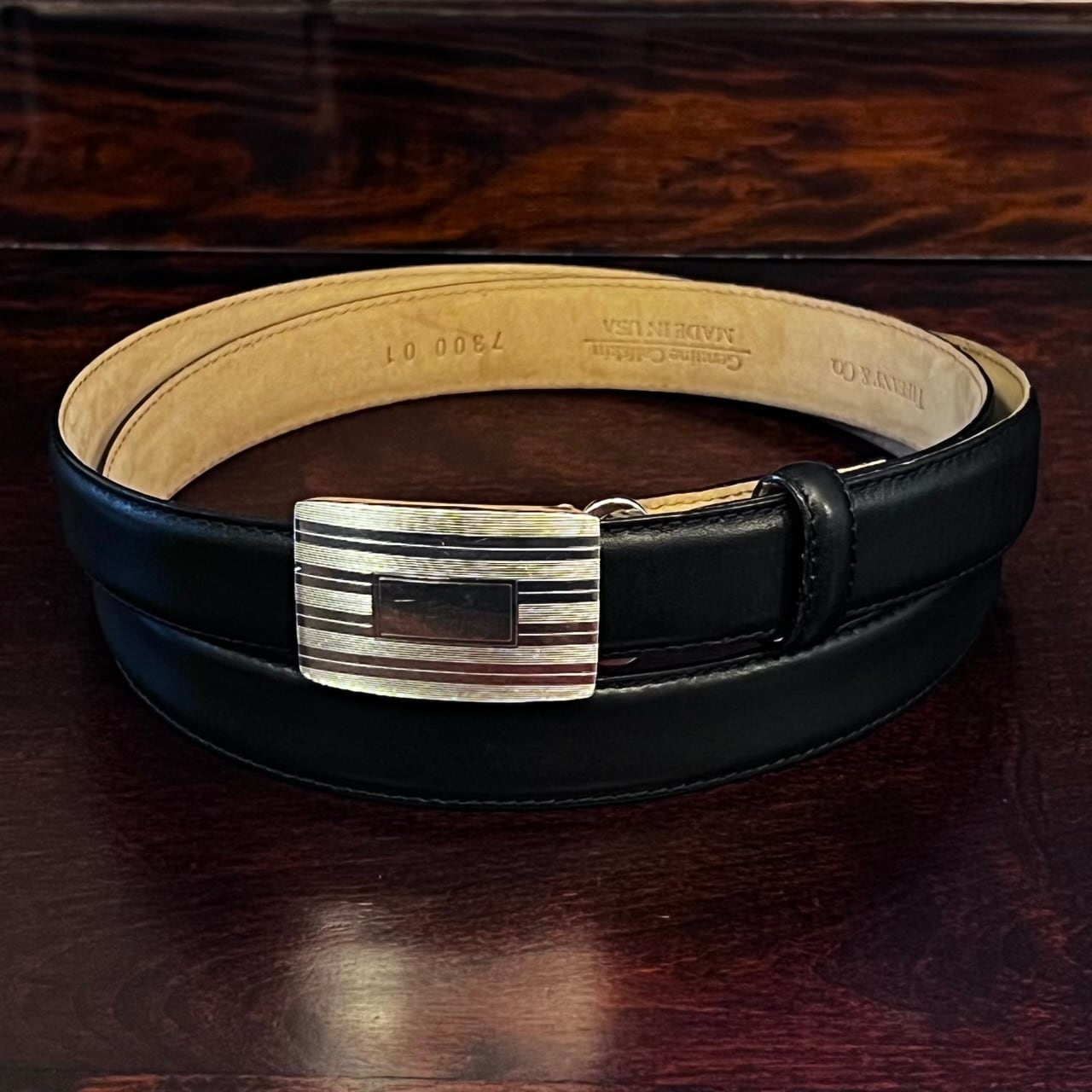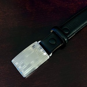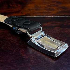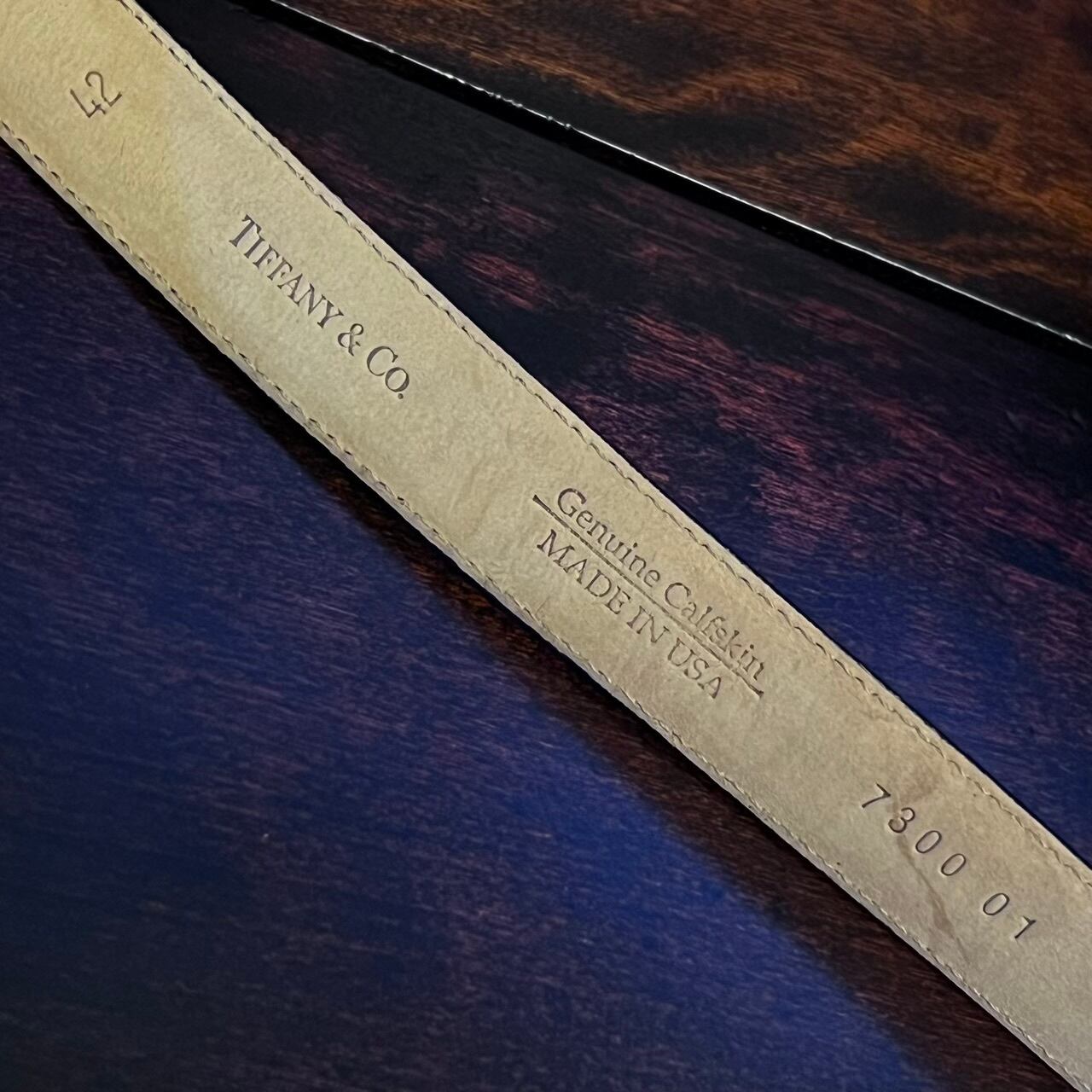 ベルトはブラックのカーフレザーでサイズは42インチ、バックルをスナップボタンで着脱できるティファニー純正のベルトです。5つ穴などで着用サイズがある程度固定されたベルトと違い、スライドバックルなのでベルトに穴が無くお好きな位置で留める事が可能な為、約118cmとかなり長いですが、余りを多く垂らせる希少なサイズでもあります。