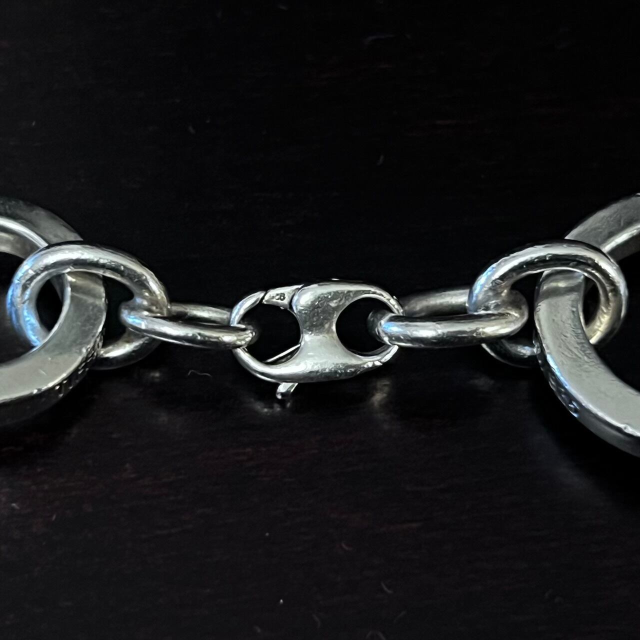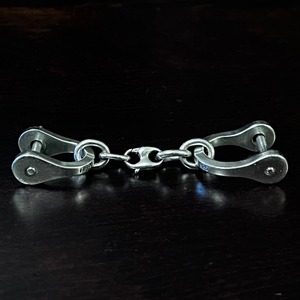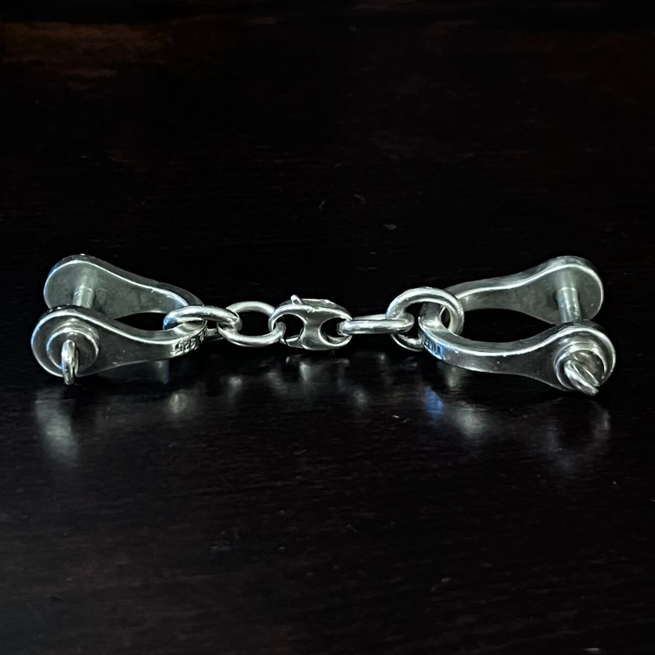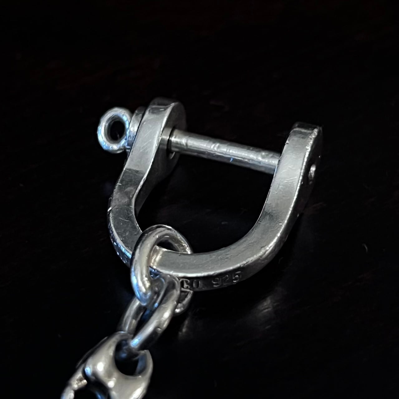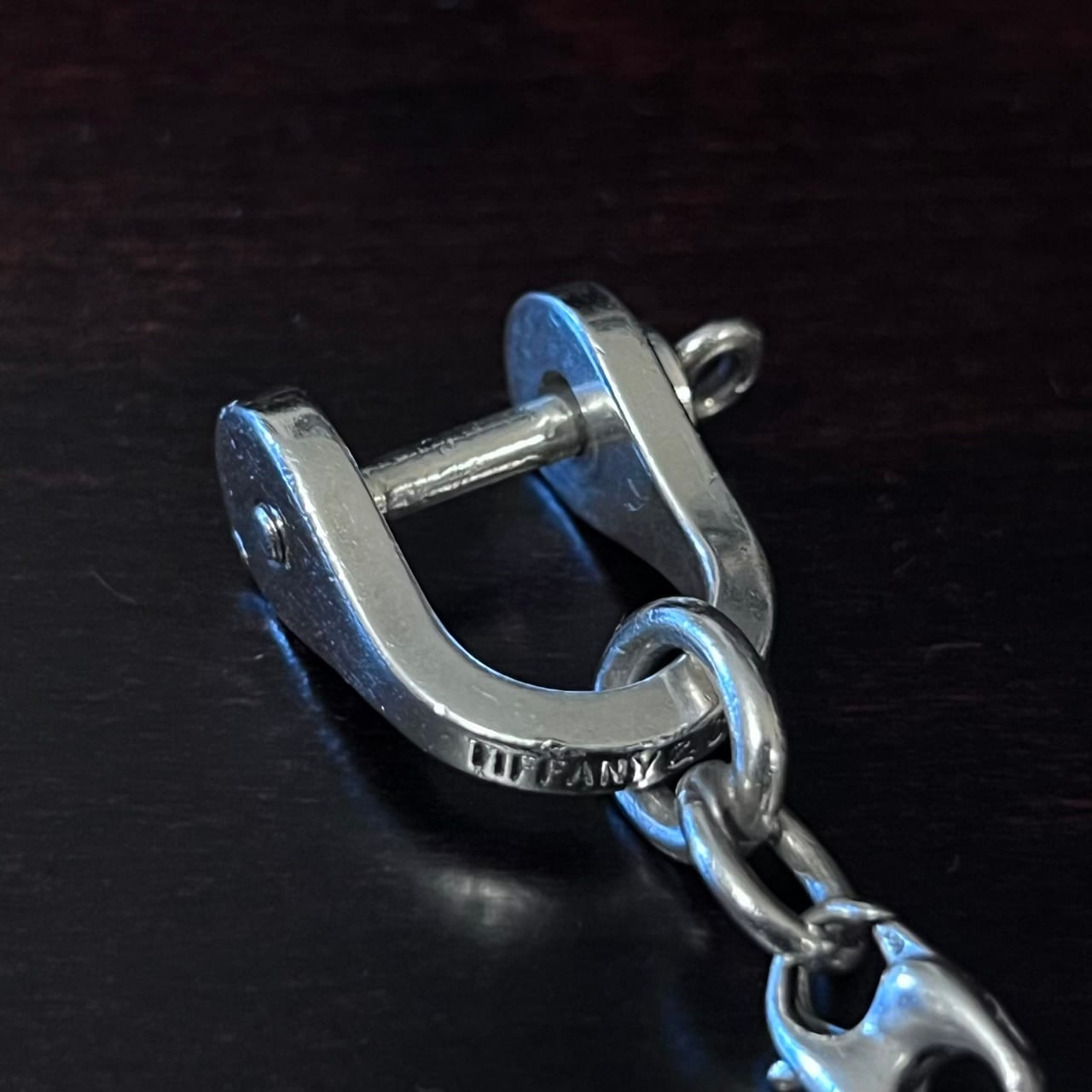 ティファニーでは1970年代頃からシャックルを使用した様々なキーチェーンが展開されましたが、こちらは大小2つのシャックルが地厚なチェーンで繋がれたキーホルダー、現在は廃盤のお品物です。
