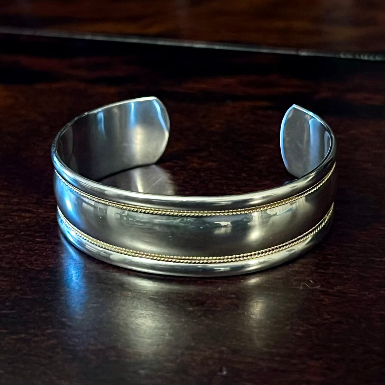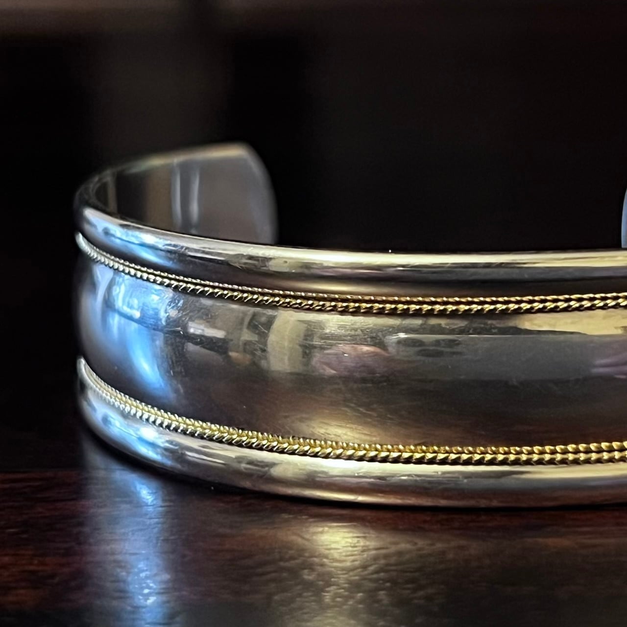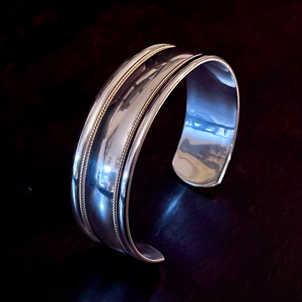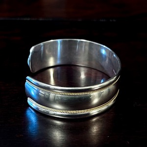 ソリッドな無垢のシルバーに18Kゴールドのツイスト ロープが2本入る極めてシンプルなデザイン、1990年代に展開されたティファニーのカフ(オープン バングル)。