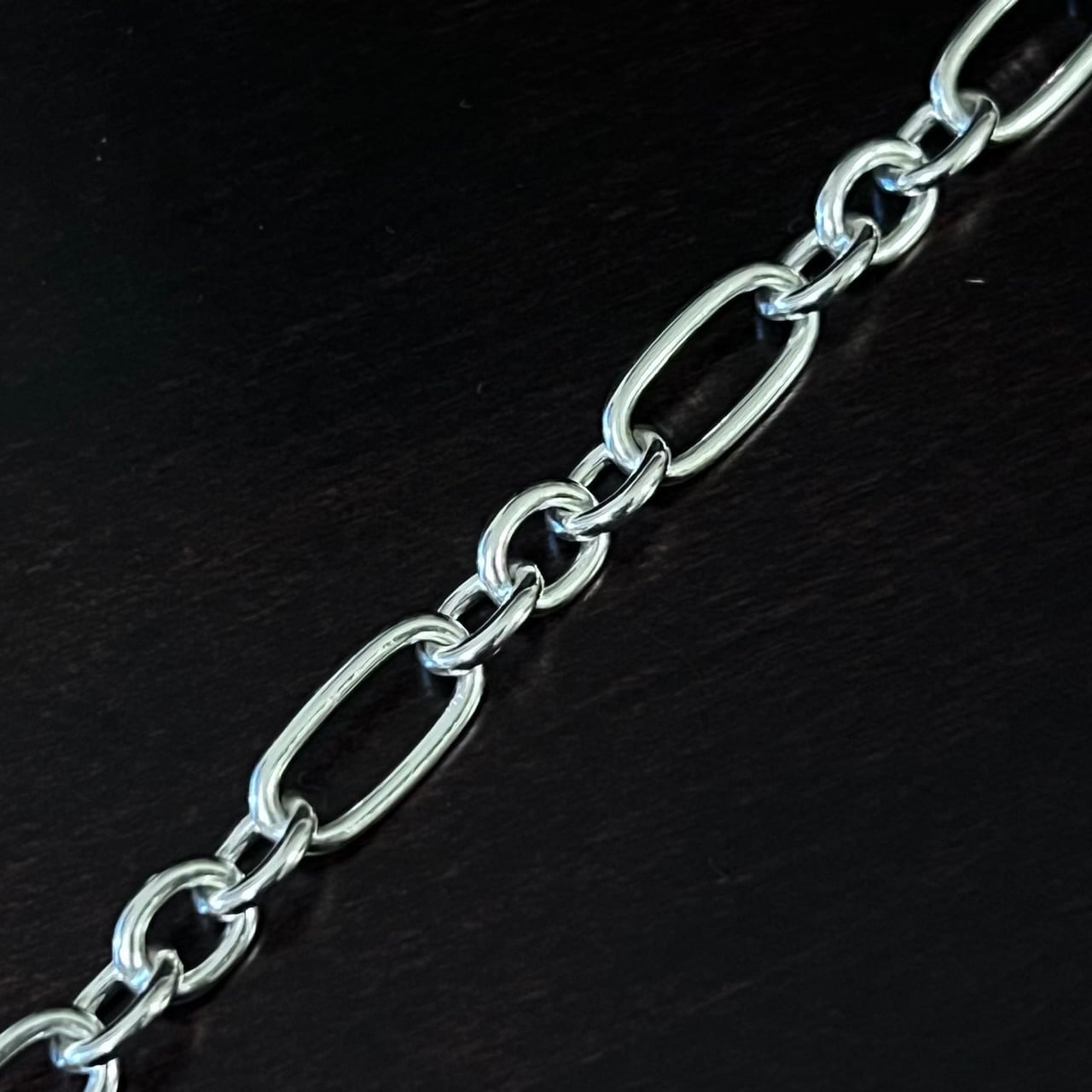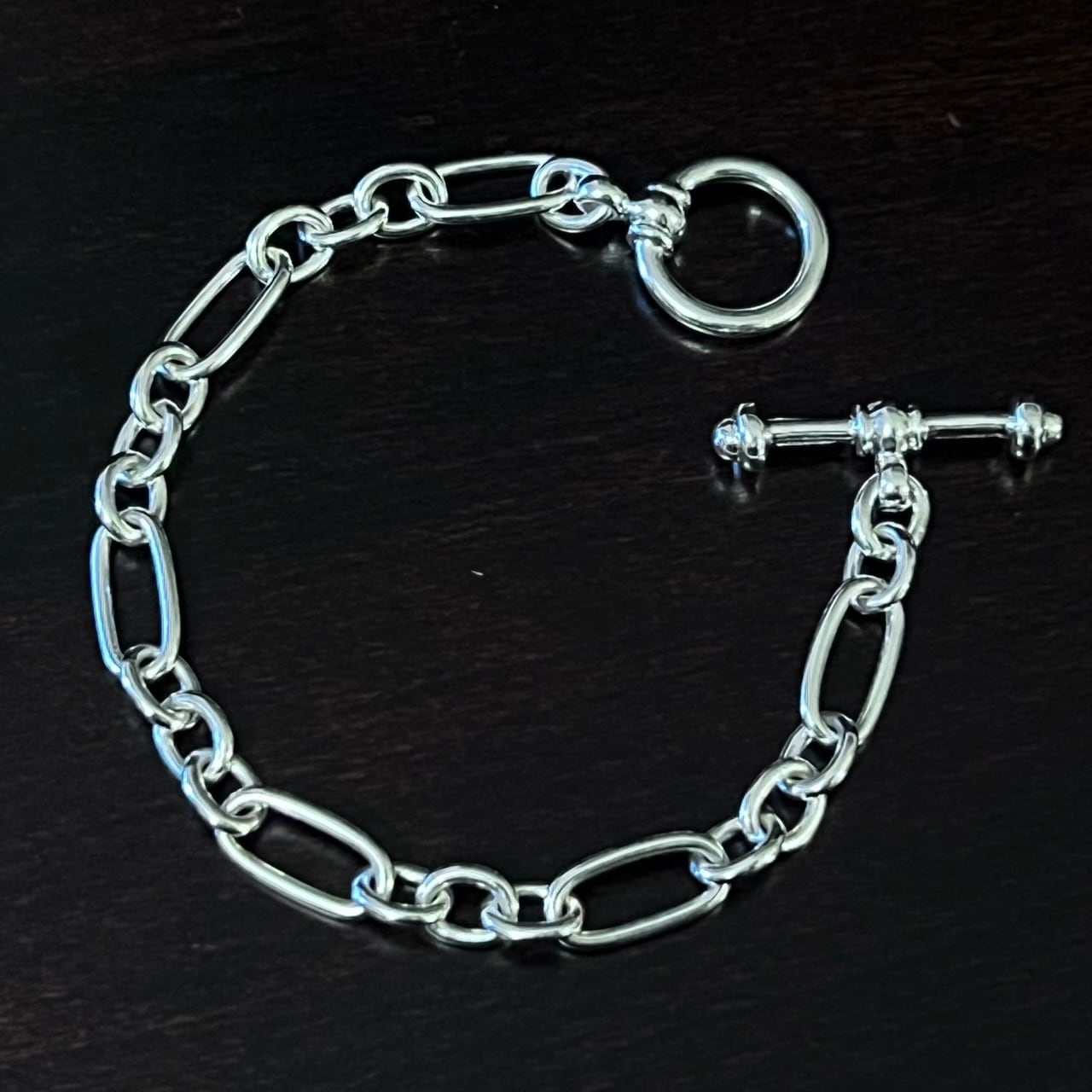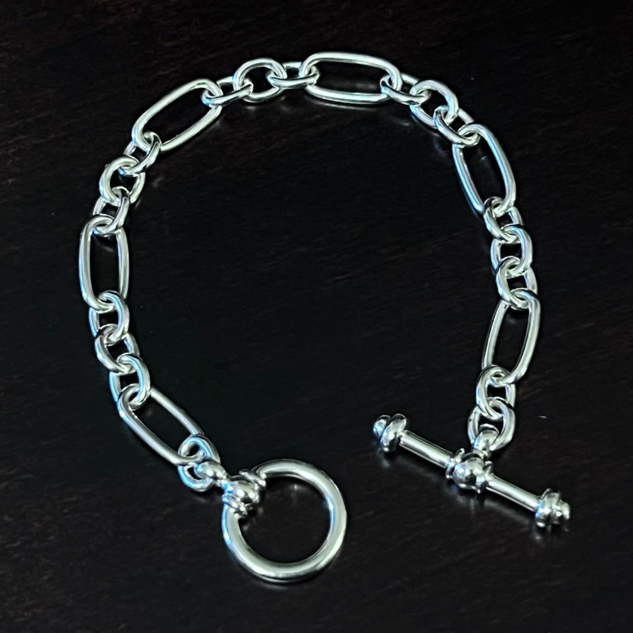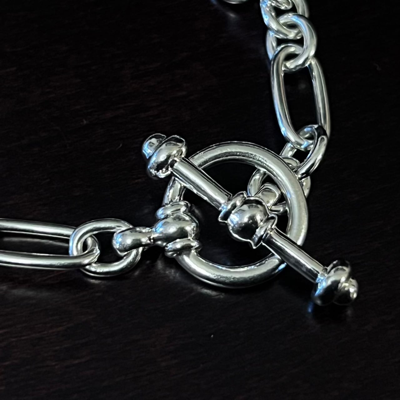 大小のオーバル リンクを組み合わせたシンプルなチェーンに、主張のあるトグルが際立つデザイン。