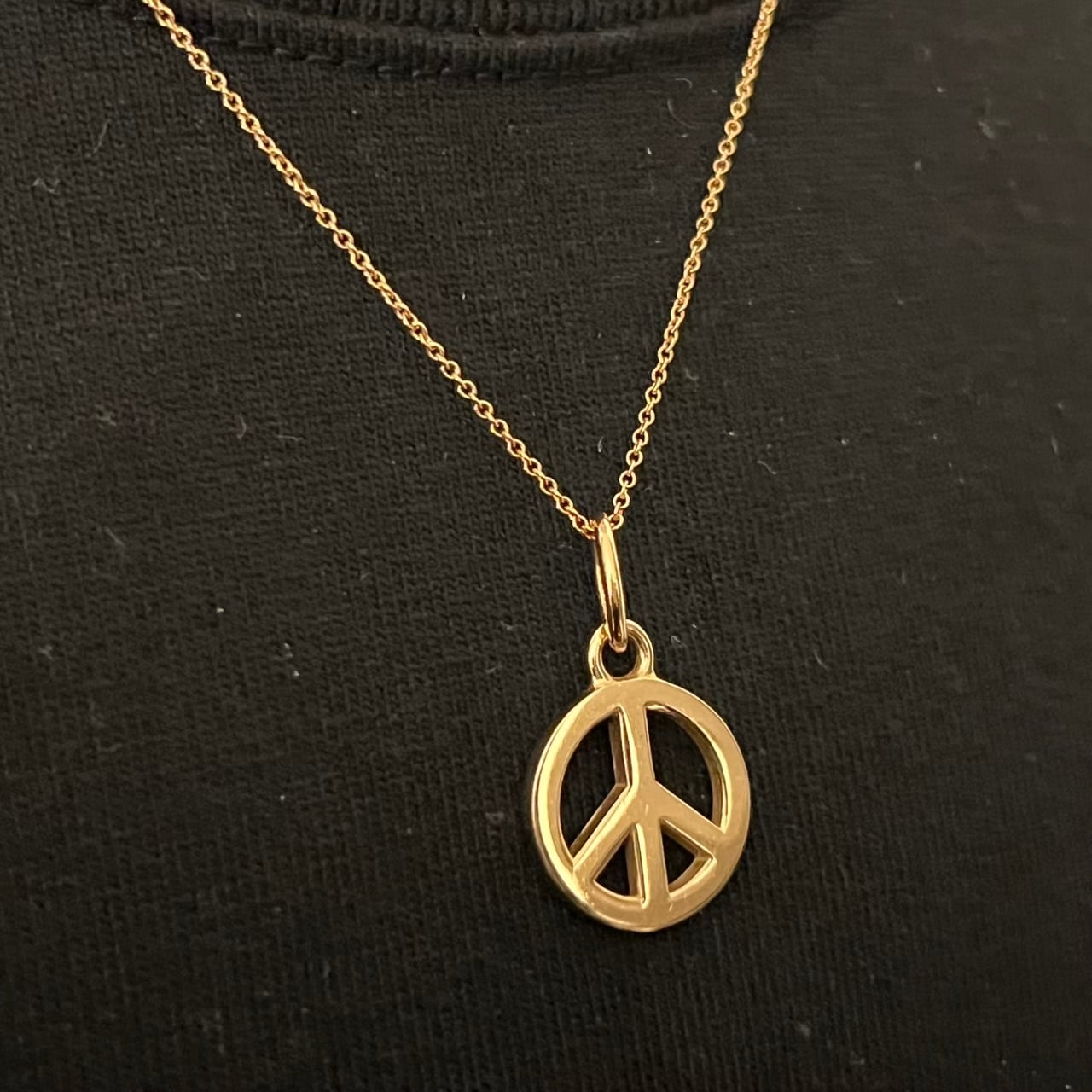 平和運動や反戦運動、核軍縮のシンボルとしても世界中で使われるピースマークのチャームをペンダント トップにセットしたティファニー製の18K ゴールド ネックレス。