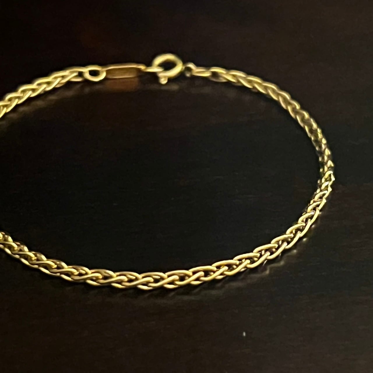 極めてシンプルな三つ編みのデザインは別名ウィートチェーンとも言いますが、細かく編み込まれた精巧な造形にゴールドの輝きが目を引きます。