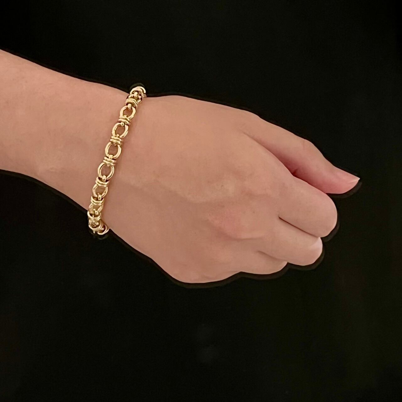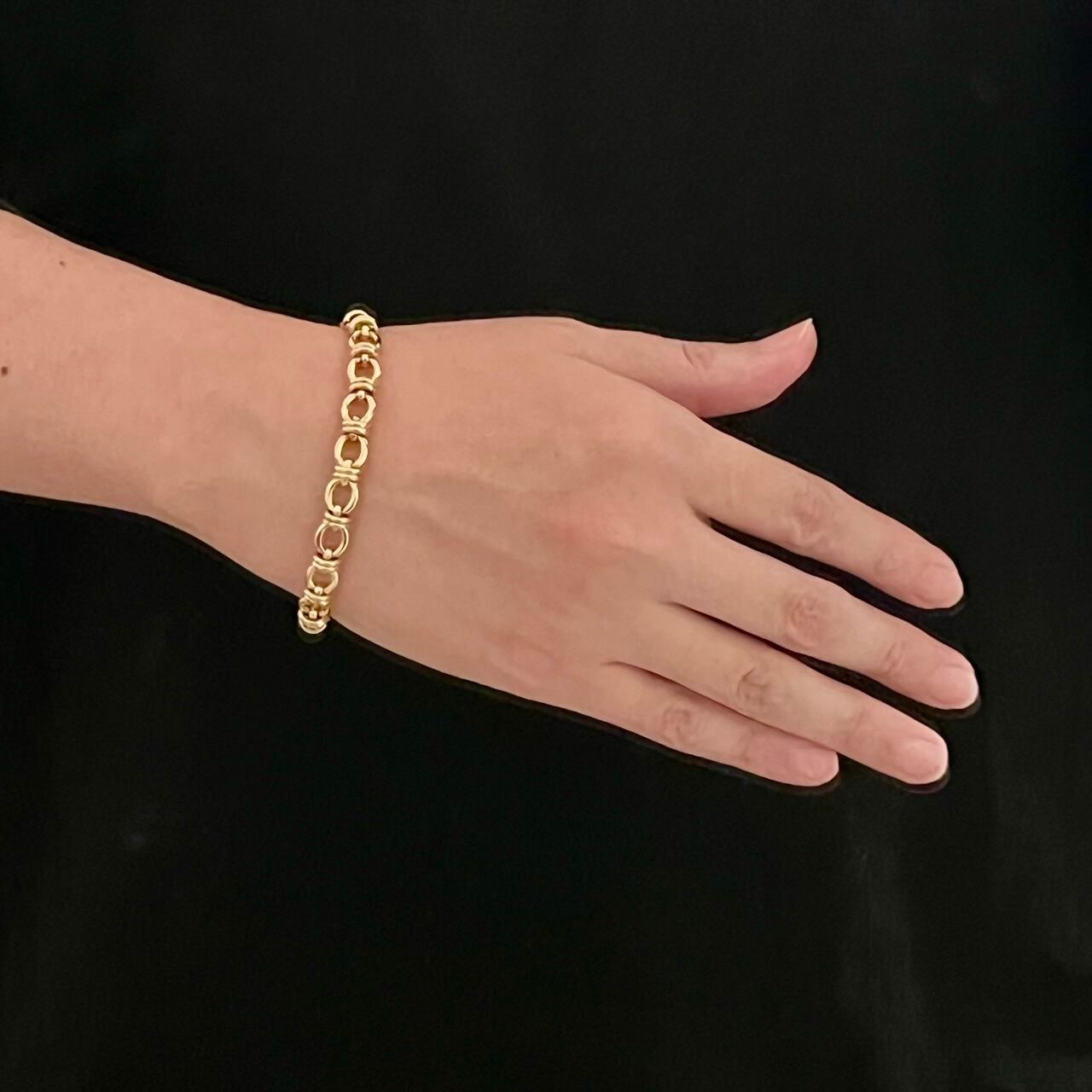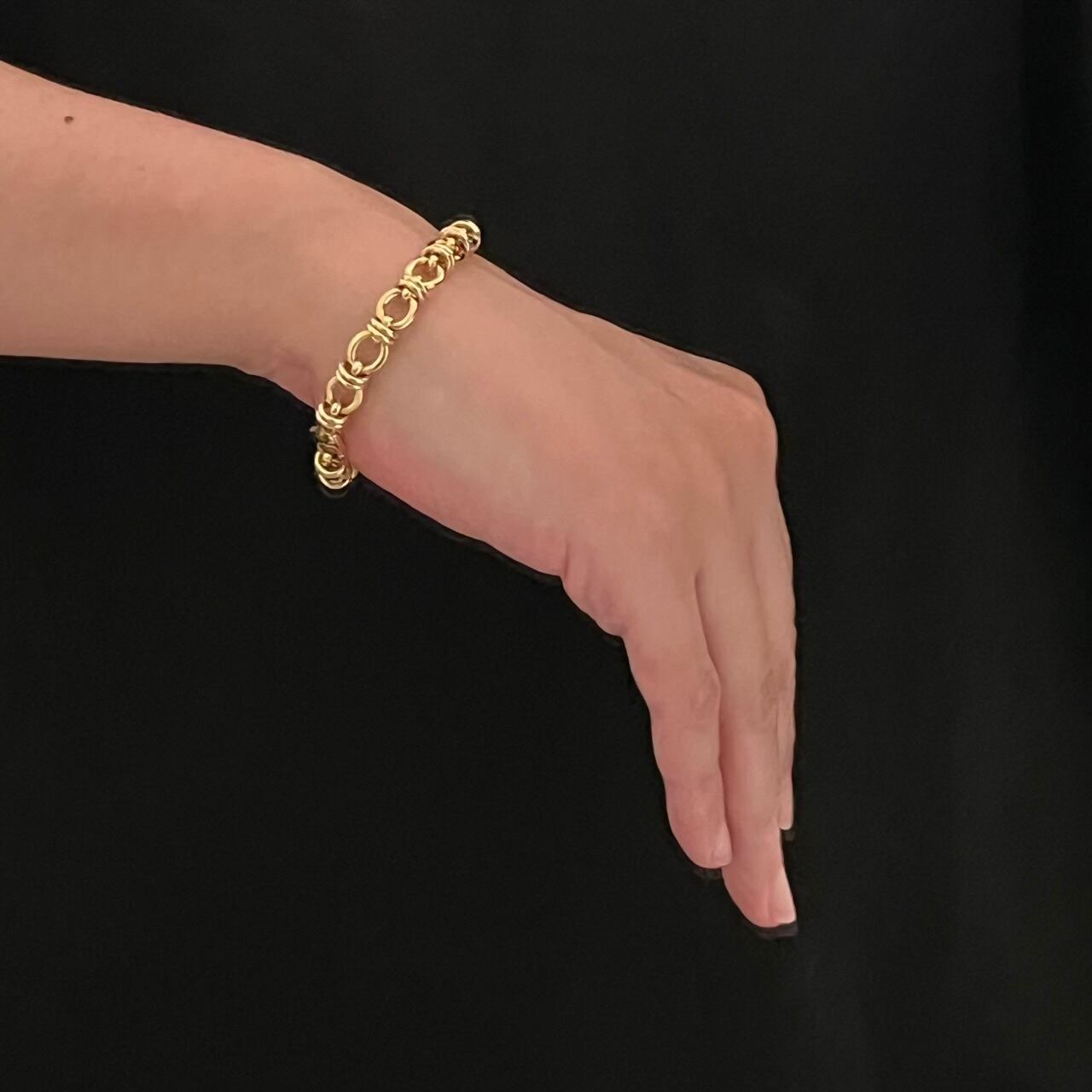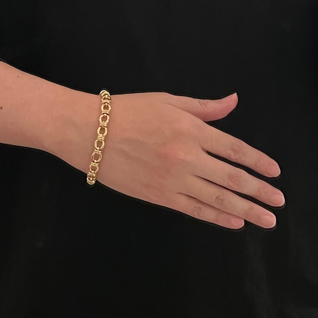 一見、ノット(結び目)のようにも見えるフォルムですが、真円のサークルリンクは固定されておらず、オーバル リンクの間を動き回転することもできるなかなか珍しいデザイン。正面を向くオーバル リンクと側面を向くサークル リンクの凹凸が立体的で独特の表情があるブレスレットです。