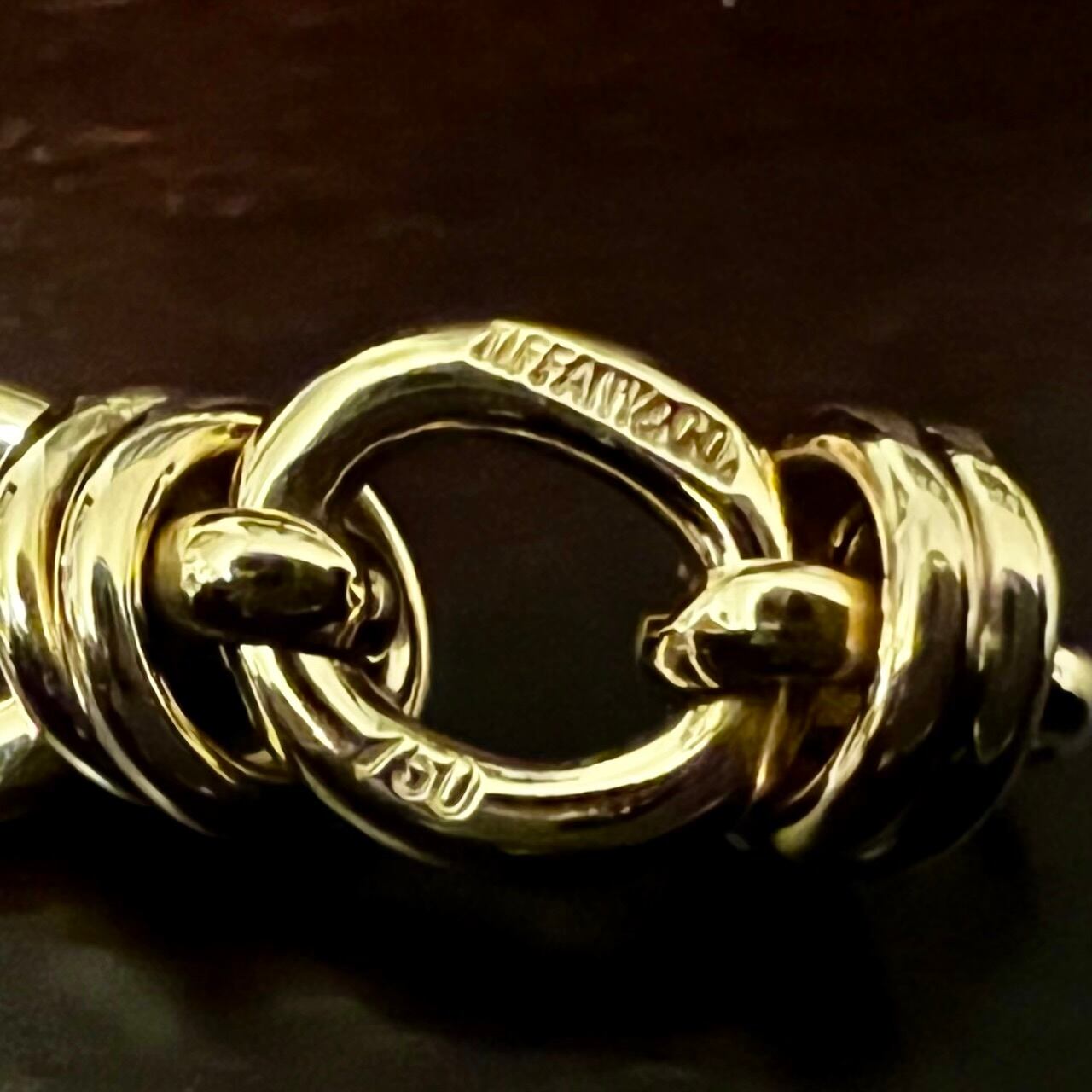 留め具はロブスター クラスプで端のオーバル リンクにはティファニーのホールマークと18金製を示す750の刻印が入ります。