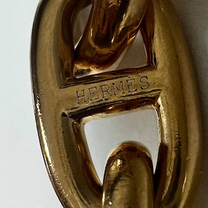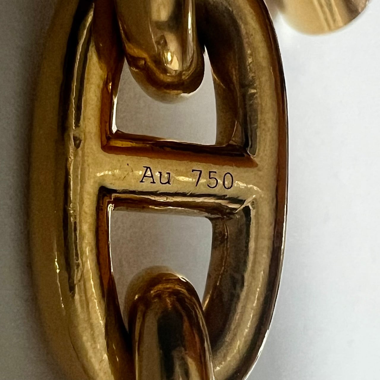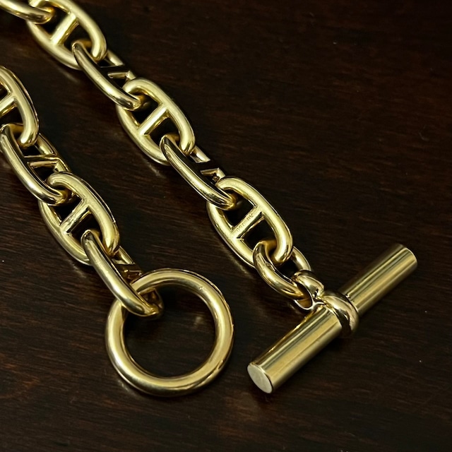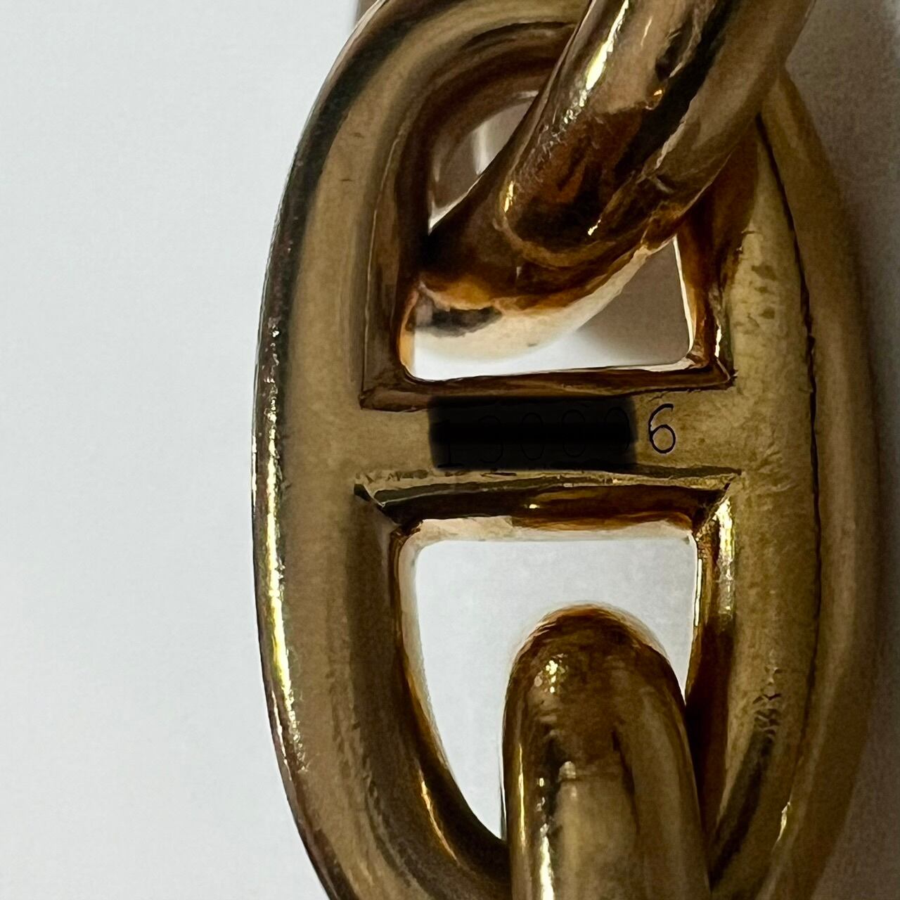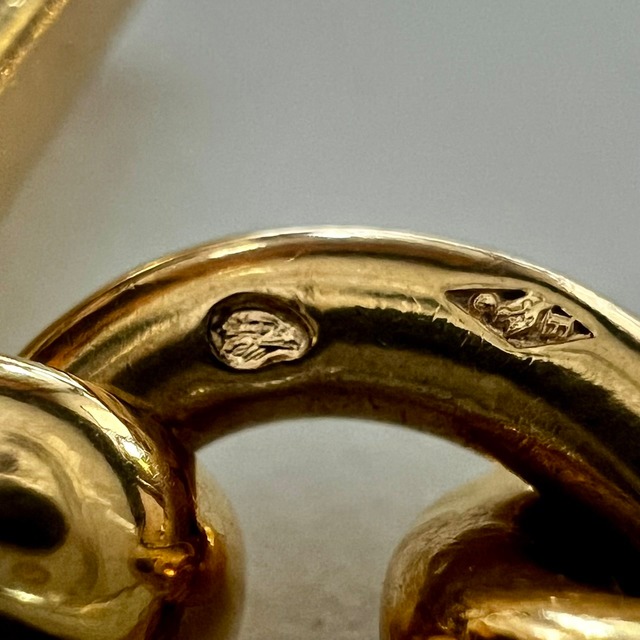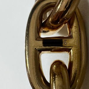 コマの形状はマルジェラ期に近いですが、ホールマークの入り方が少し異なり、HERMÈSの刻印とシリアルナンバーはマンテル リングの隣のアンカーチェーンのコマに、18金を示すEAGLE HEADとメイカーズマークはトグル横の丸カンに、Au 750はその隣のアンカーチェンのコマに入ります。