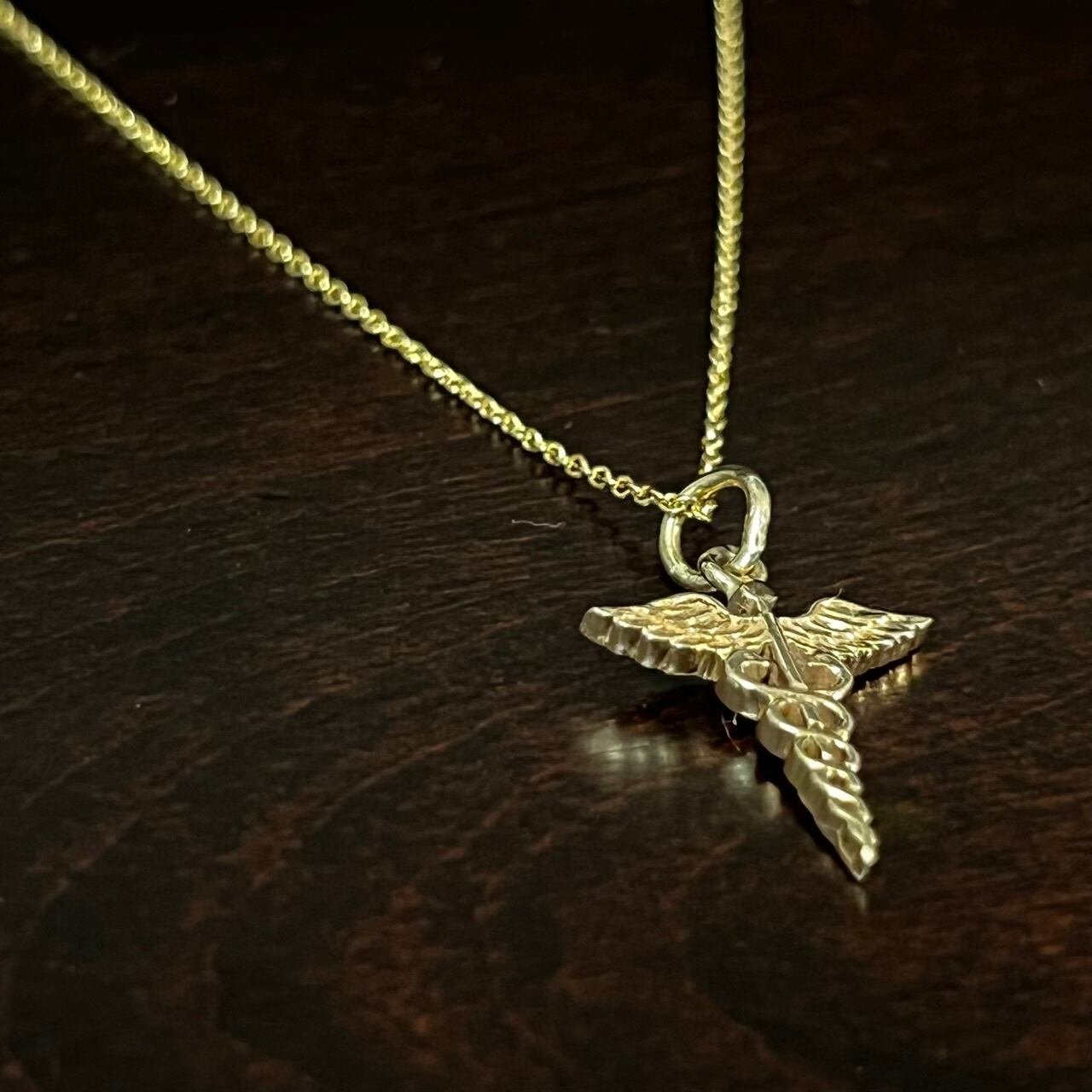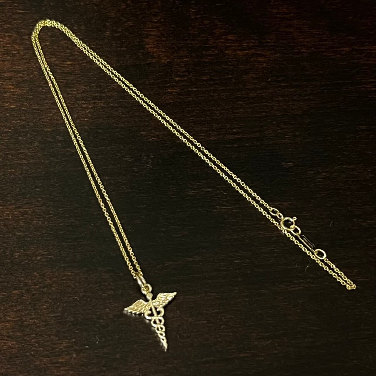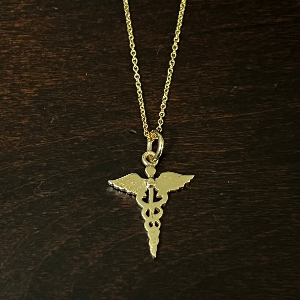 こちらは非常に珍しい14Kゴールド製のカドゥケウスをペンダント トップにセットしたネックレス。