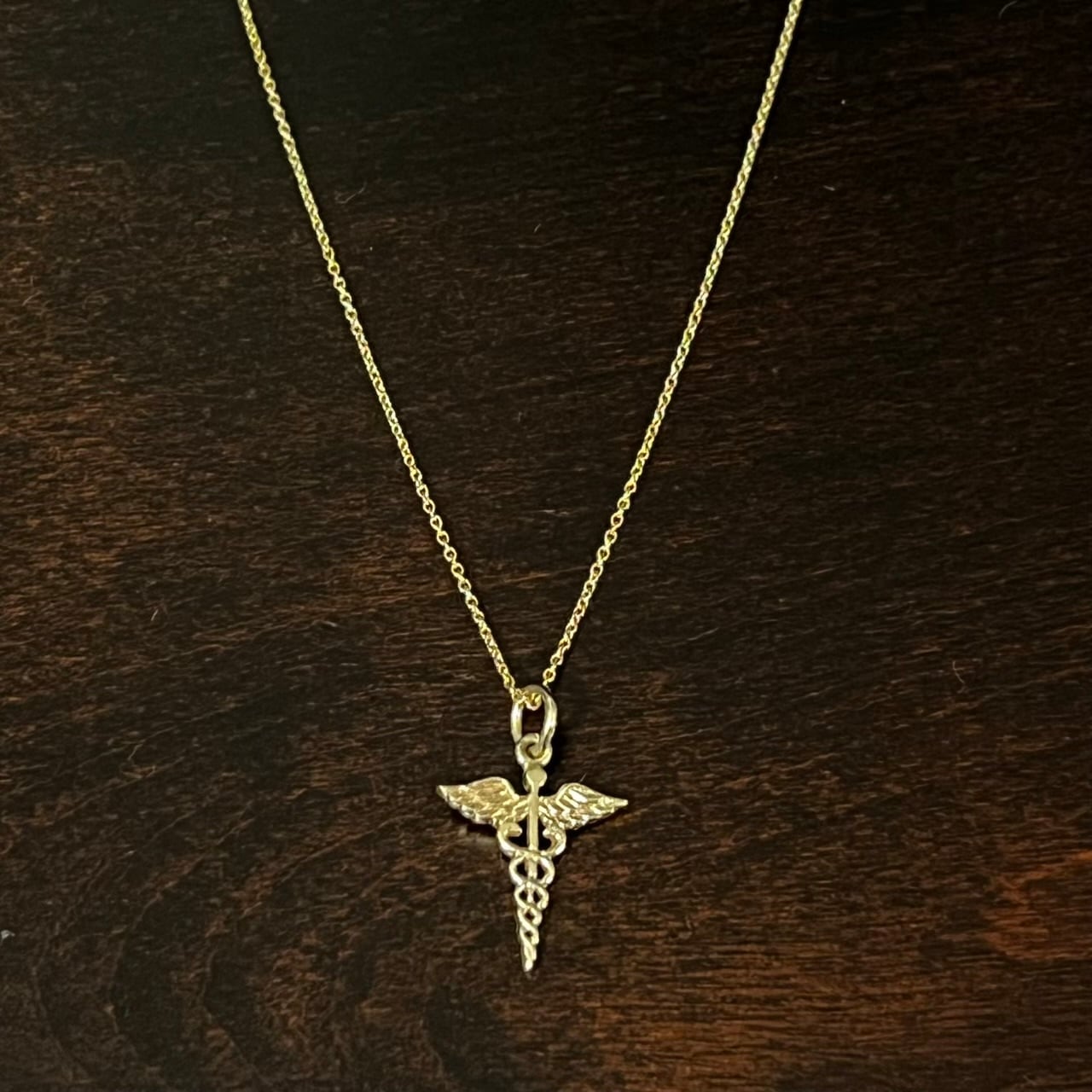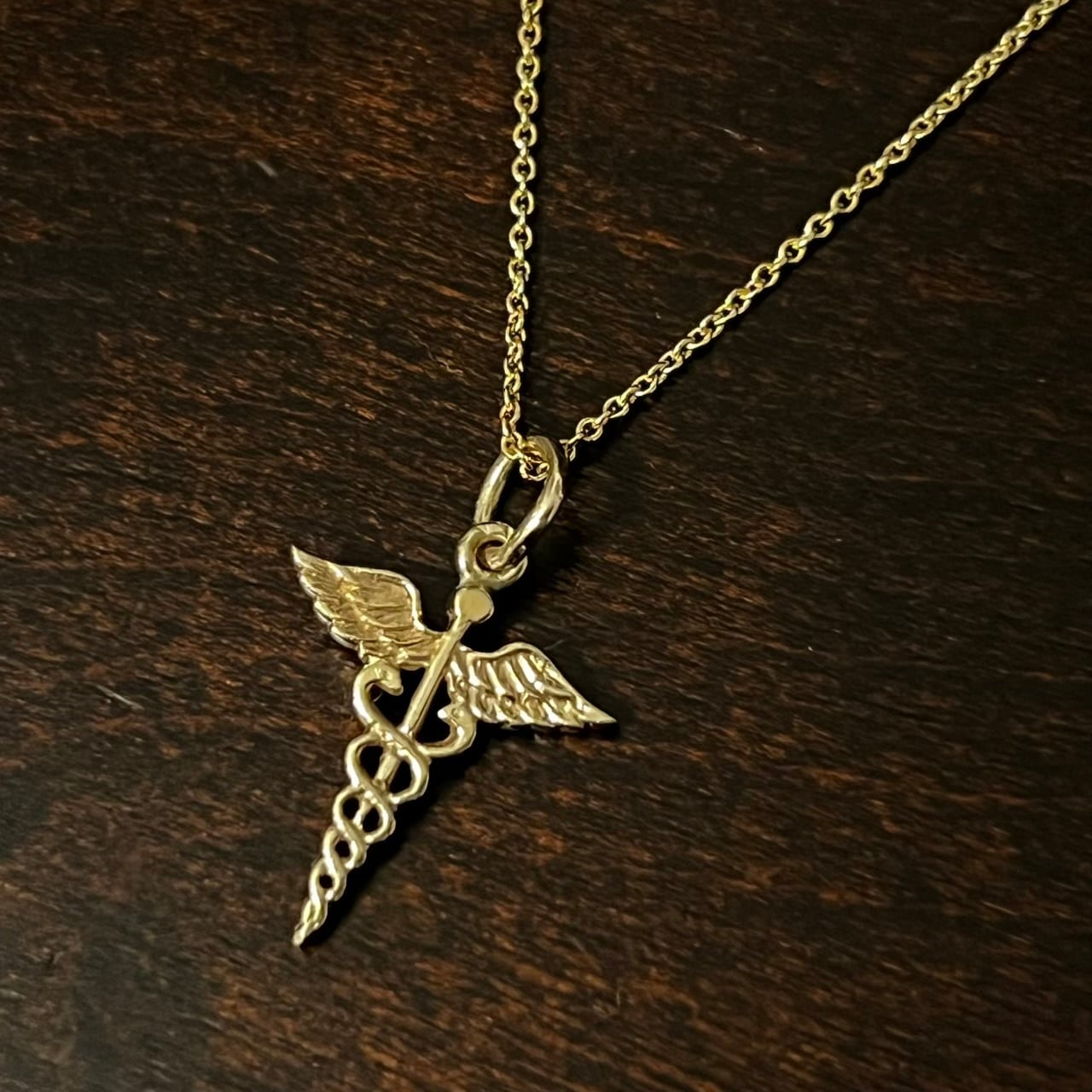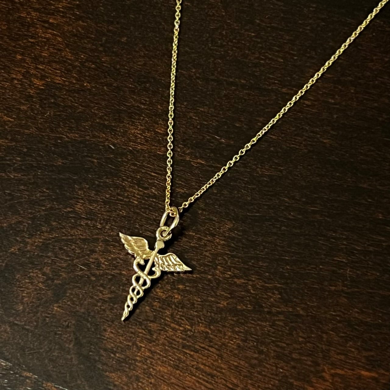 こちらは非常に珍しい14Kゴールド製のカドゥケウスをペンダント トップにセットしたネックレス。