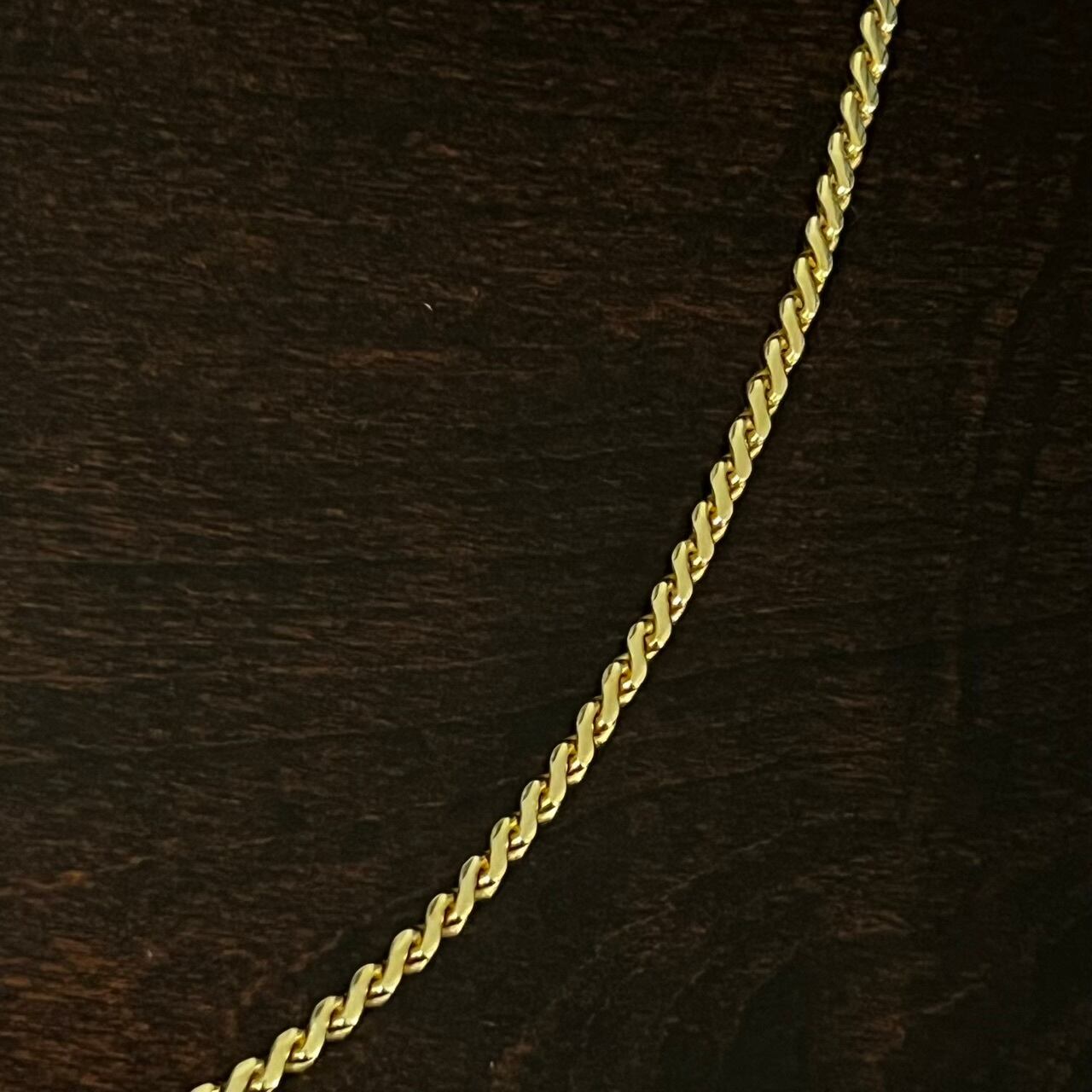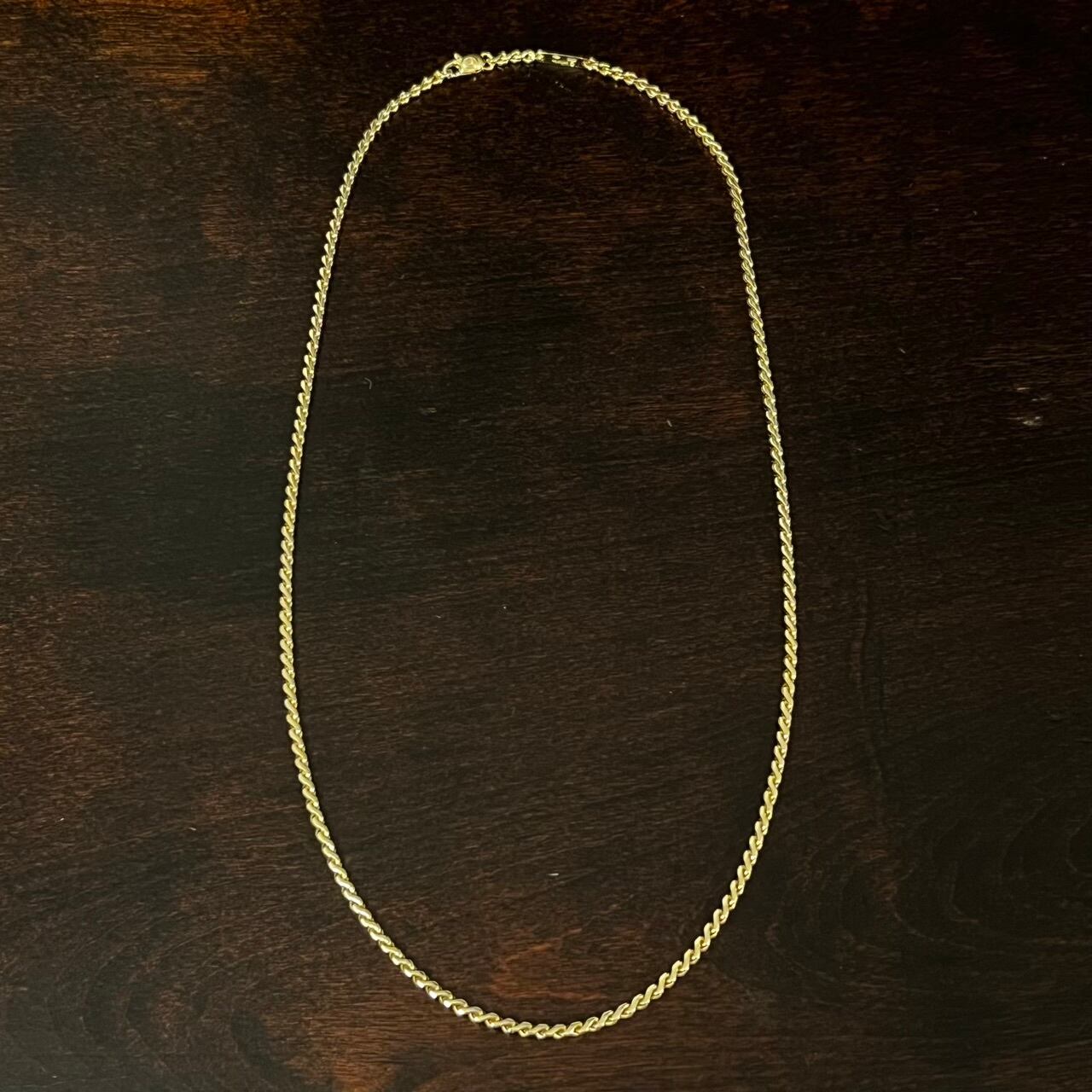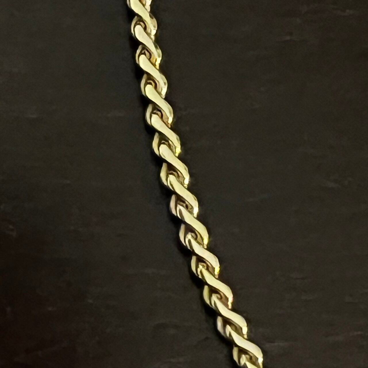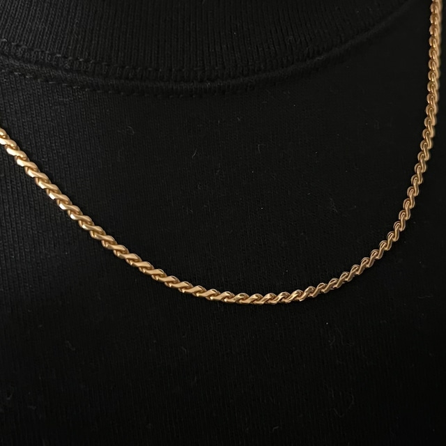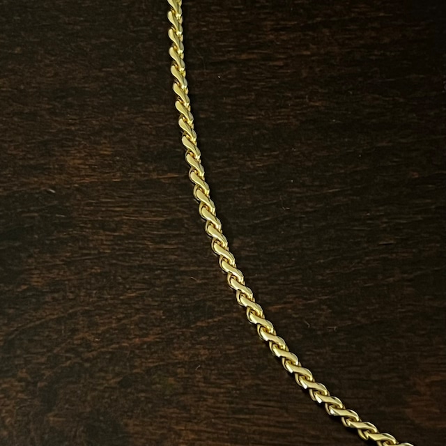 Swage=スエージとは地金に圧力を加えて変形させる加工のことで、喜平チェーンをスエージ加工すると捻られた状態でプレスされるのでS字にも見えるリンクが同じ方向に並ぶのが特徴的なデザインです。