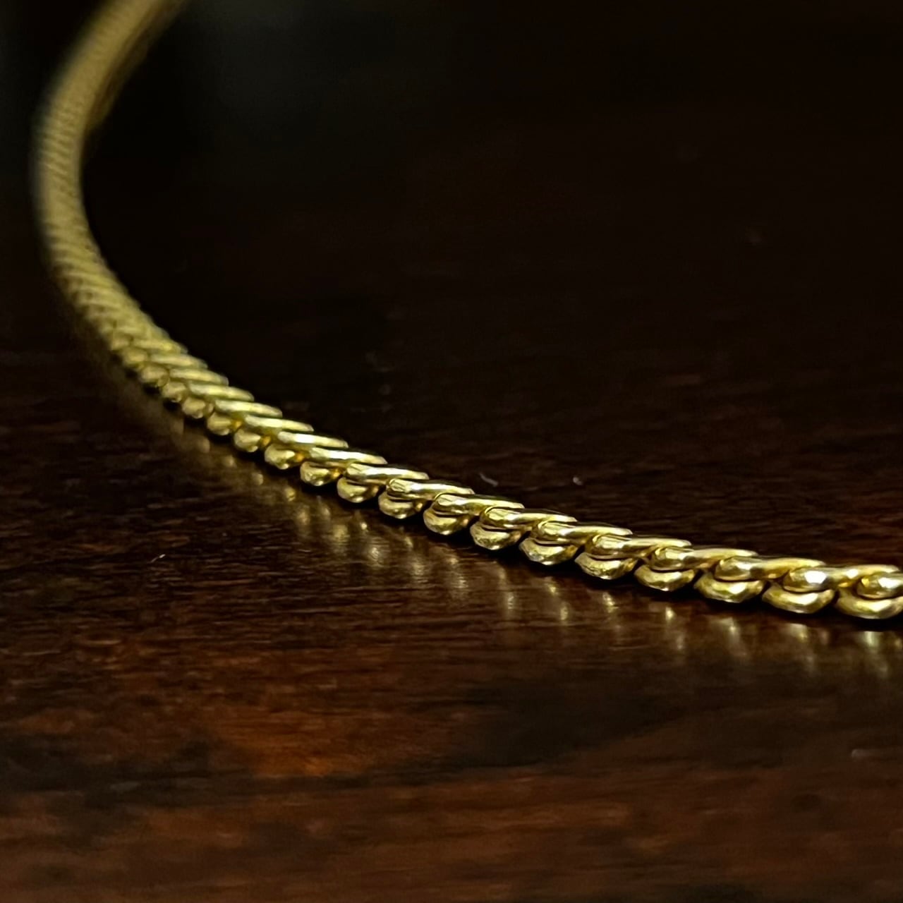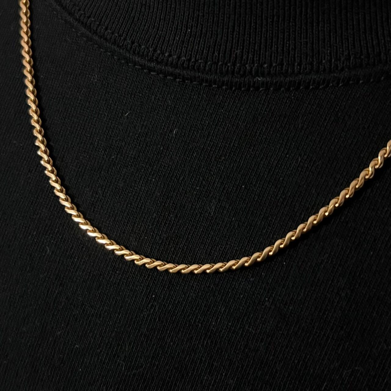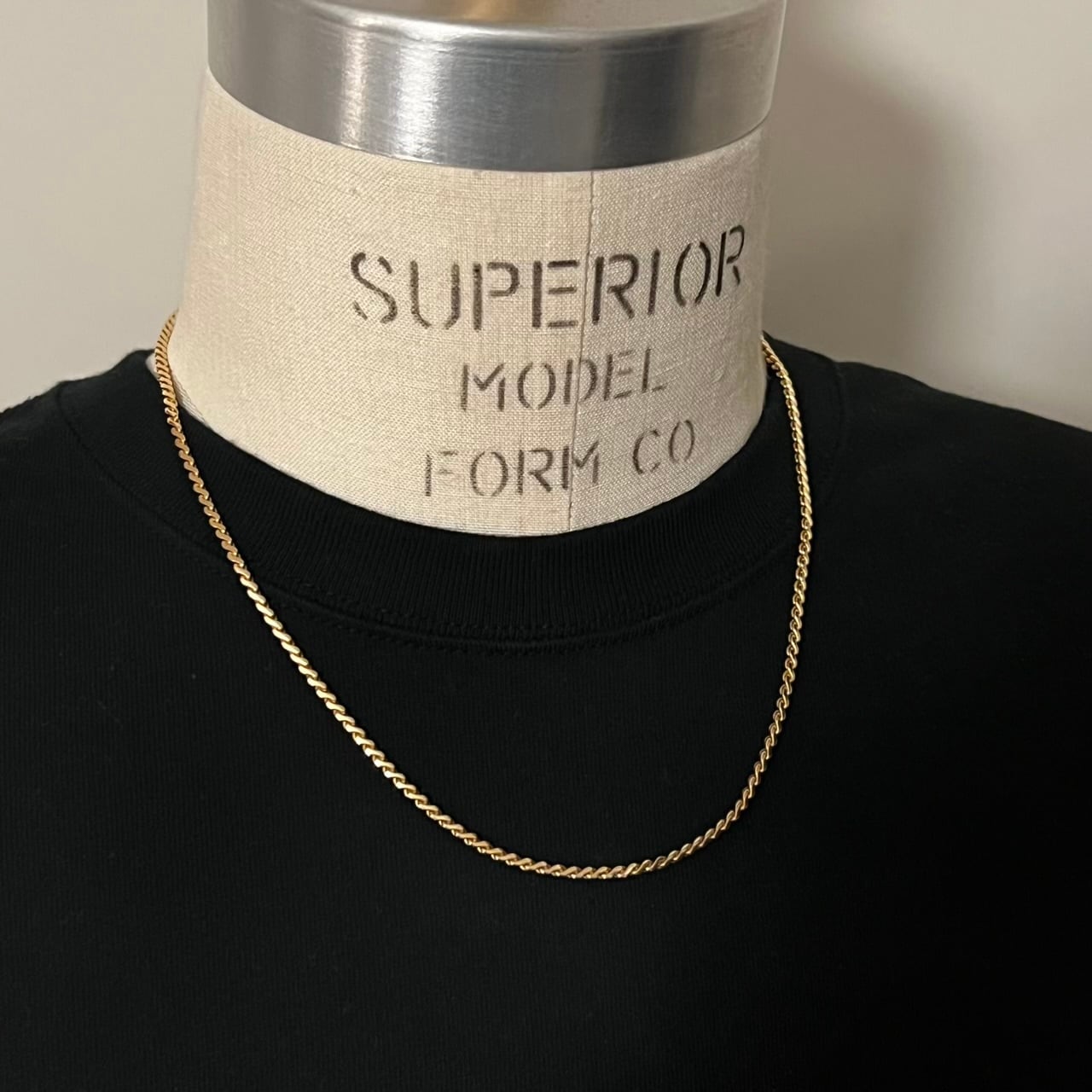 チェーンは太すぎでも細すぎでもない絶妙な太さでゴールド特有の派手さもなく、全長も約50cmと最も使い勝手が良い人気のサイズ。単体での着用でも上品な存在感はありますが、主張の少ない細幅のネックレスなので、他のネックレスとの重ね付けにも適したボリューム感でもあります。
