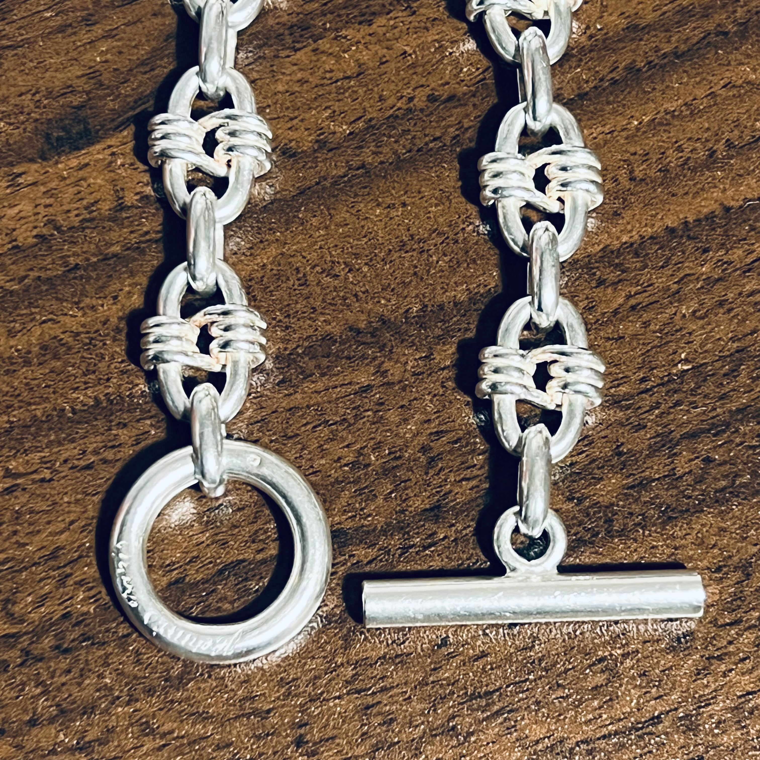 オーバル型のコマは3重に巻き付けられたシルバーのコードで両端が繋がれた造形、大変手の込んだ独特なチェーンワークで細かなディテールが印象的な作品です。
