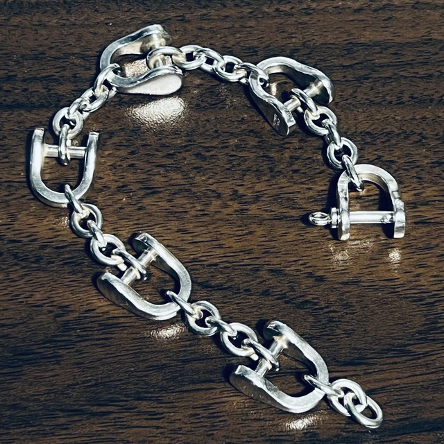 スターリング シルバー製の6つのシャックル リンクがオーバル型のケーブル チェーンで繋がれたシンプルなデザイン。留め具に用いるシャックルのみに付く開口部を横切るボルトを回してチェーンを通すことで着脱が可能です。