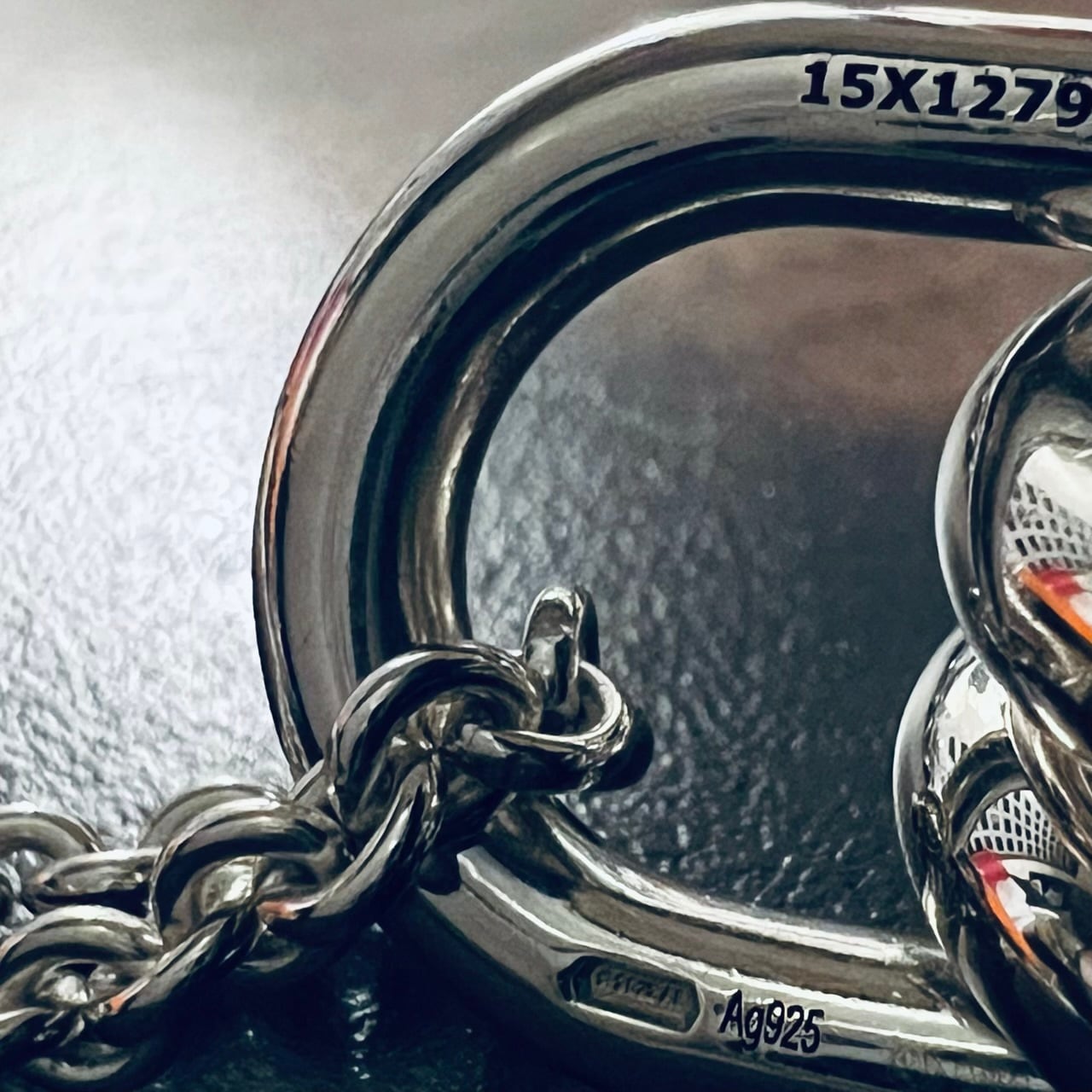 ペンダント上部のオーバル リンクにはHERMÈSとMade in Italyの刻印、シリアルナンバーとイタリアの都市アレッサンドリアのメーカーが製造したことを示す☆3022 ALのメイカーズマークが入ります。また、この個体はスイスで流通・販売されていた物なので、Ag925の右横にスイスのNATIONAL CONTROL MARKのセント・バーナード(犬)と、CCM(Common Control Mark)の925も入ります。