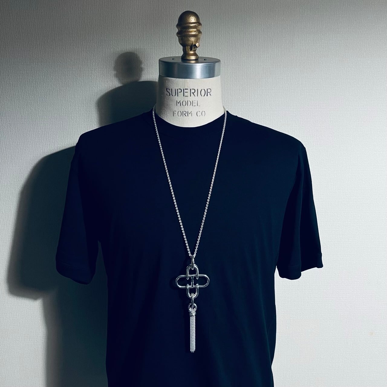 その下には合計16本のチェーン フリンジが付き優美な仕上がり、男女ともにご使用いただける印象的なタッセル ネックレスです。