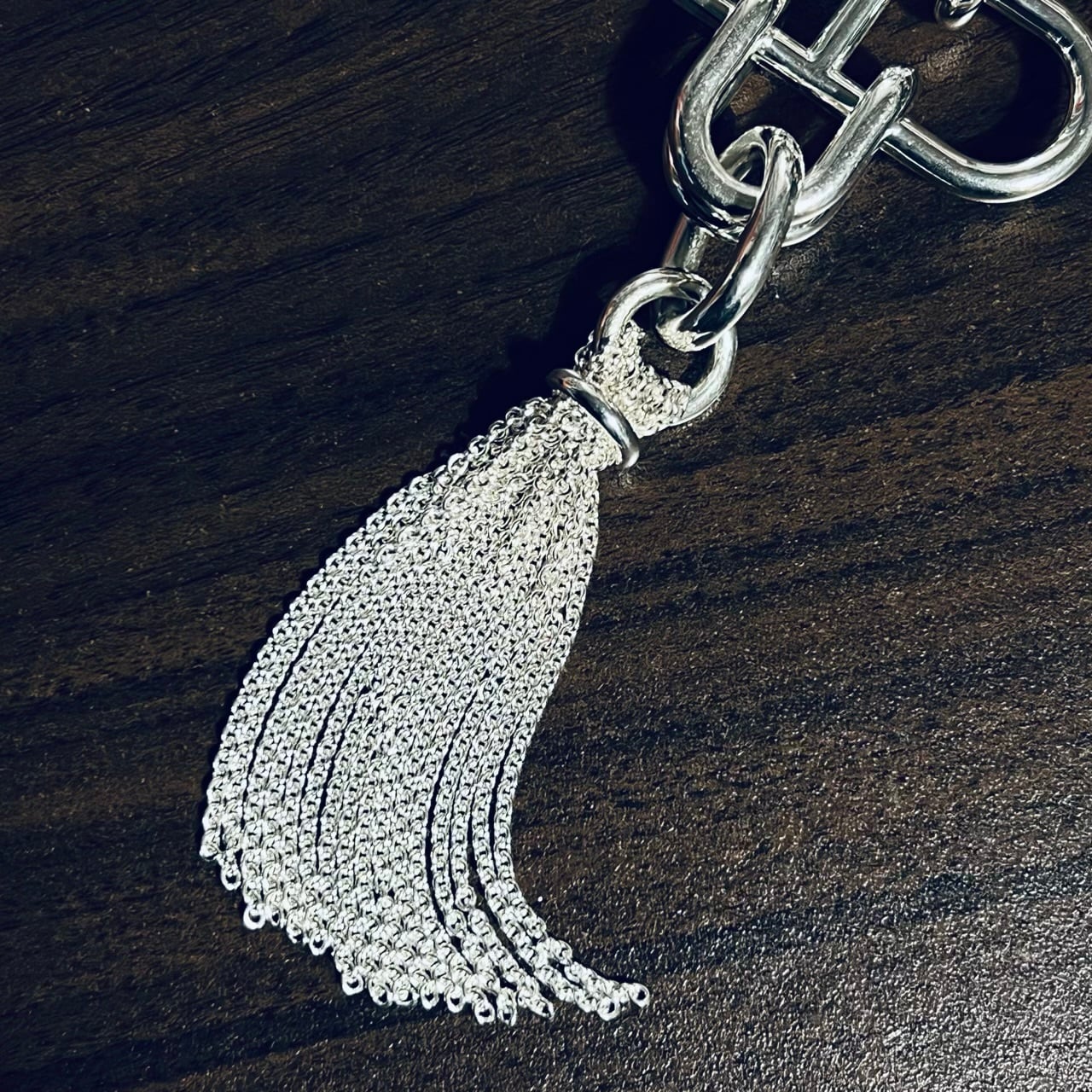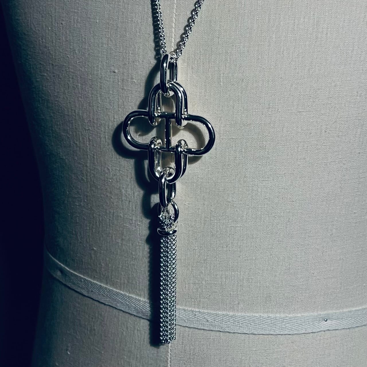 重厚なシルバーで表現された存在感のあるペンダントと、しなやかに揺れるタッセルで構成されたバランスの取れたデザインが特徴的なエルメスのローズドメール タッセル ネックレス。